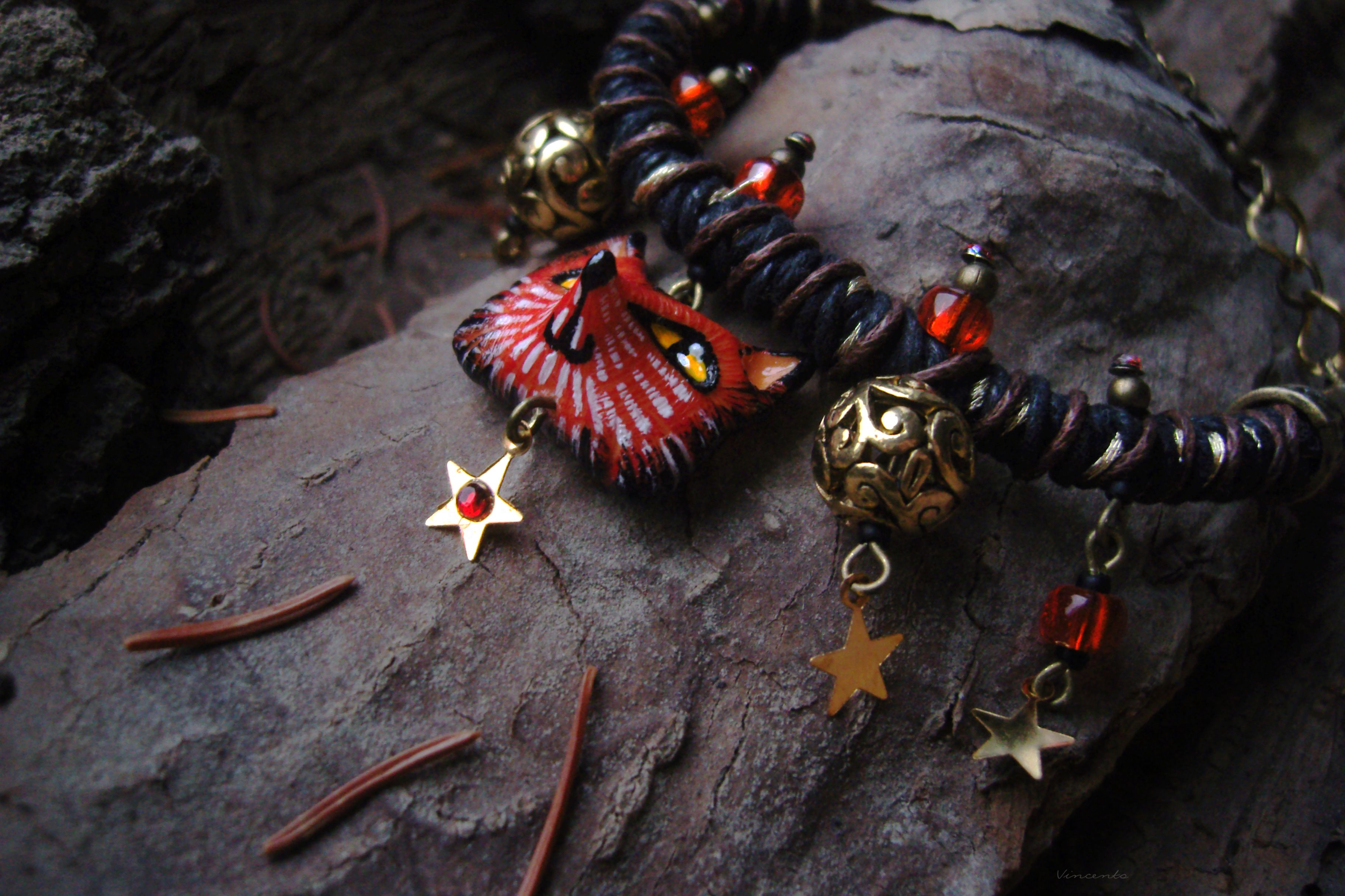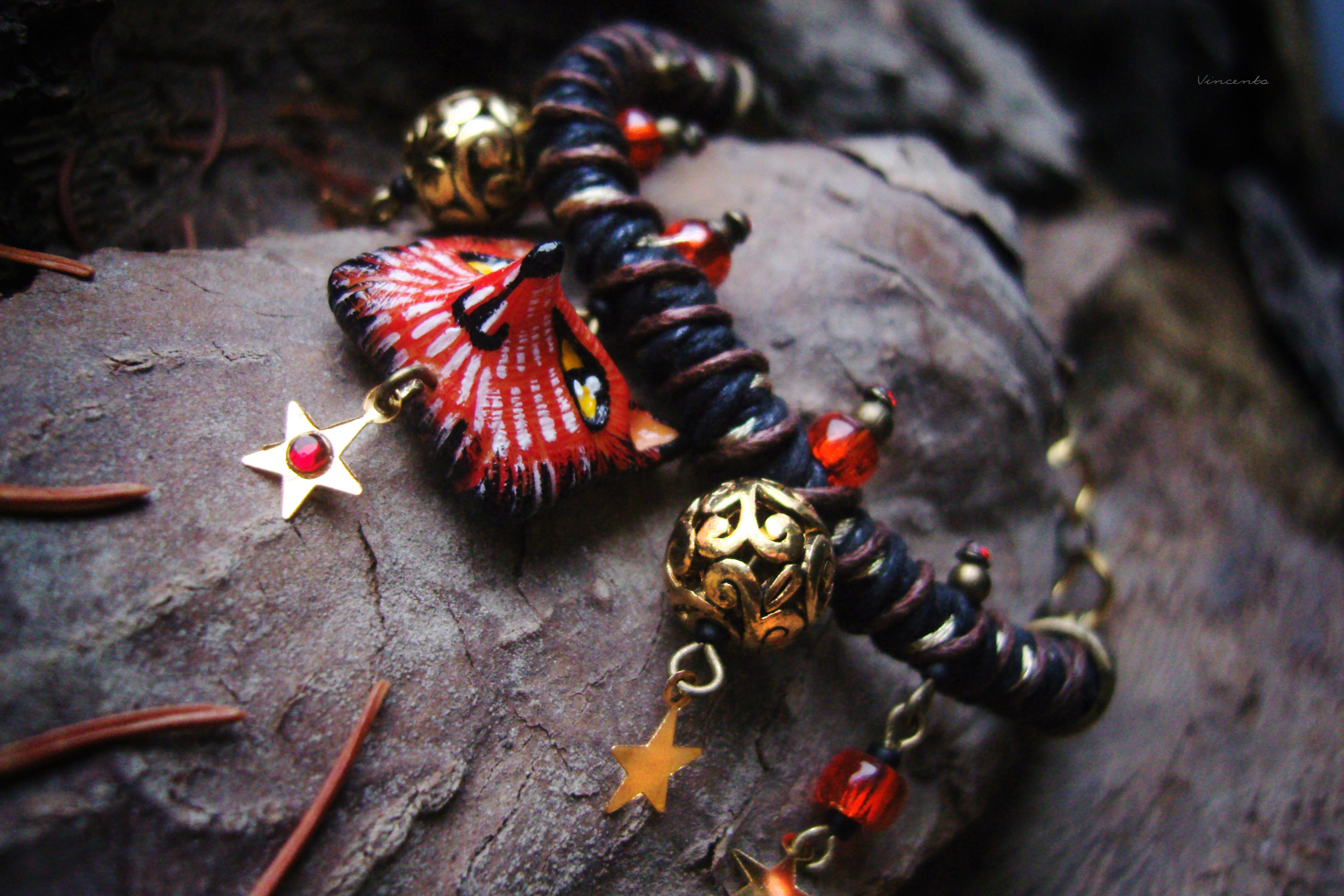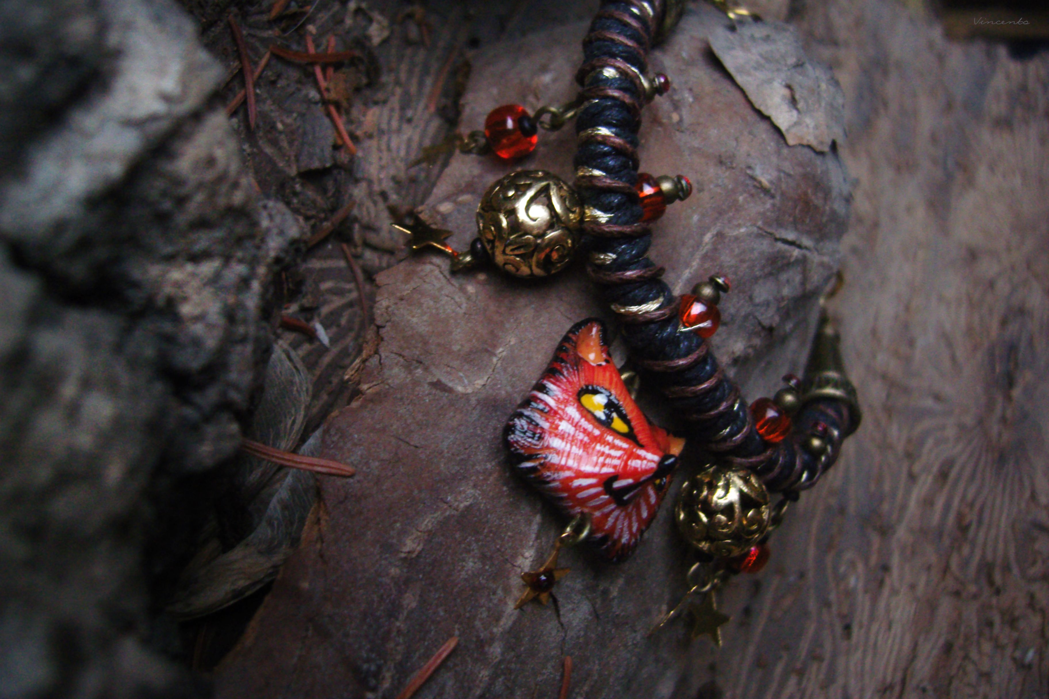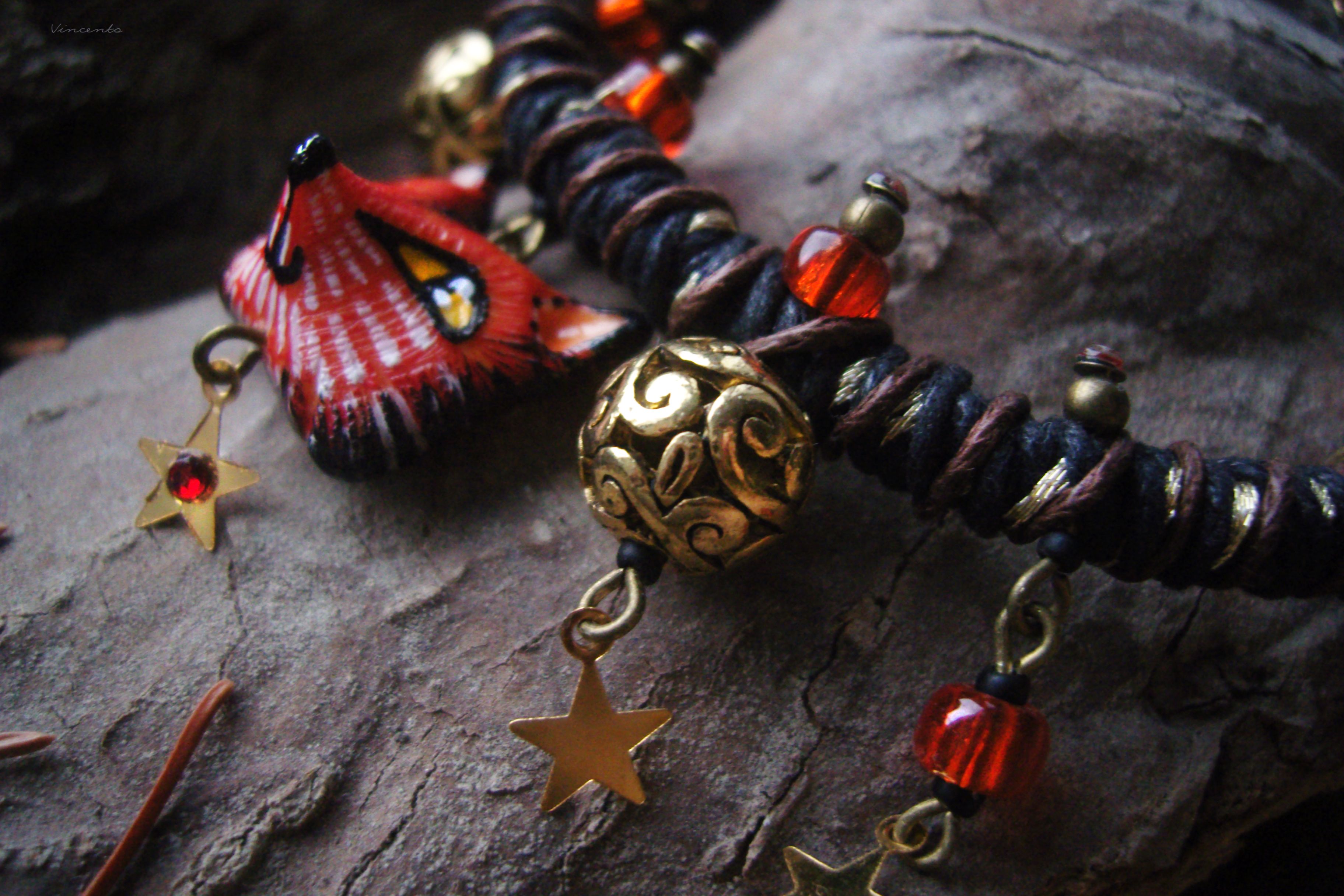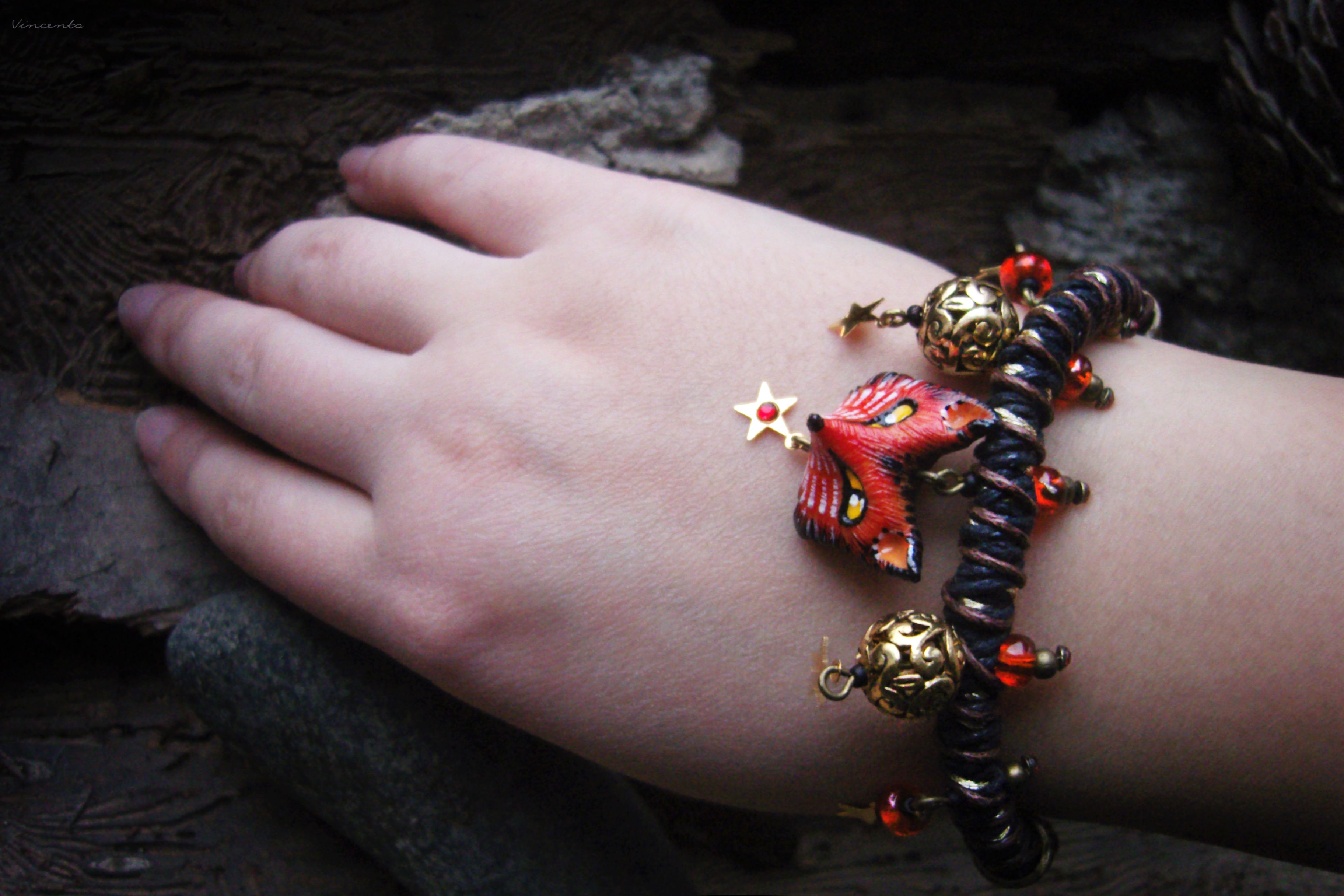 - Яркий, праздничный и совершенно волшебный браслетик на плетёном жгуте с красивыми кружевными сферами, фигуркой рыжей царевны-лисы и тонкими золотистыми звёздочками.