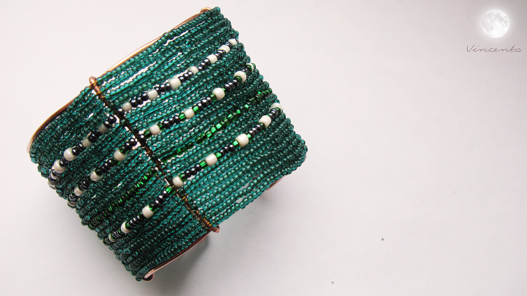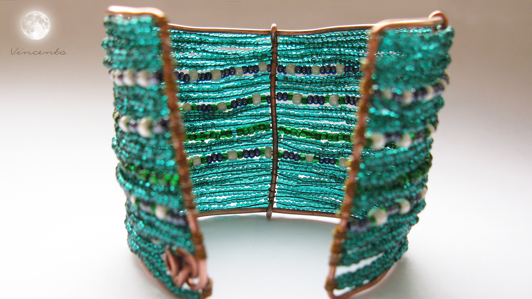 - "Туманный Авалон" - широкий браслет из бисера, выполненный в мистической, сине-зелёной цветовой гамме с вставками из перламутрового крупного бисера. Каркас браслета - медная проволока.