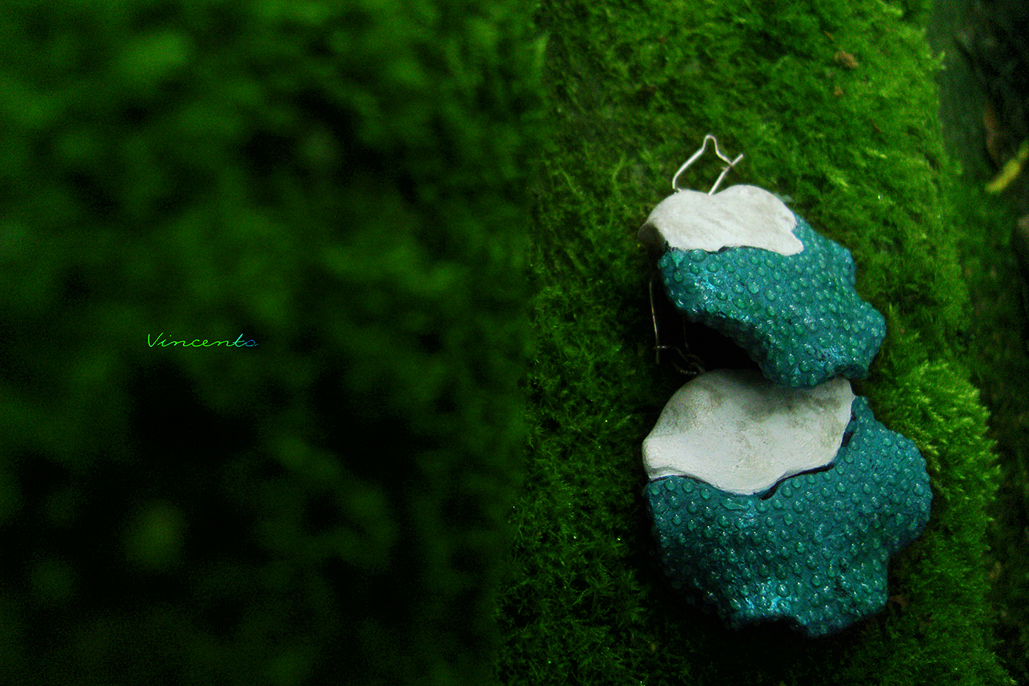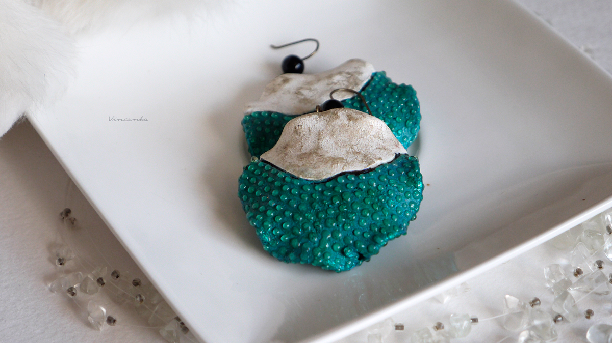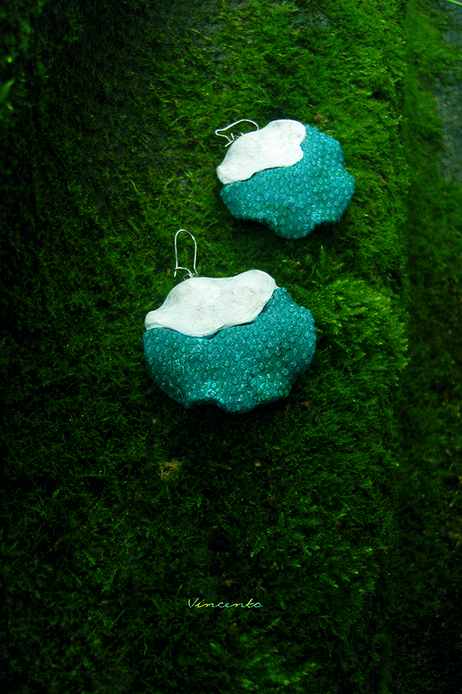 - Довольно крупные, но отнюдь не тяжёлые серьги в стиле фэнтези, по настроению напоминающие путешествие в самую чащу леса, прохладную, поросшую мхом и папоротником, мерцающую каплями росы...