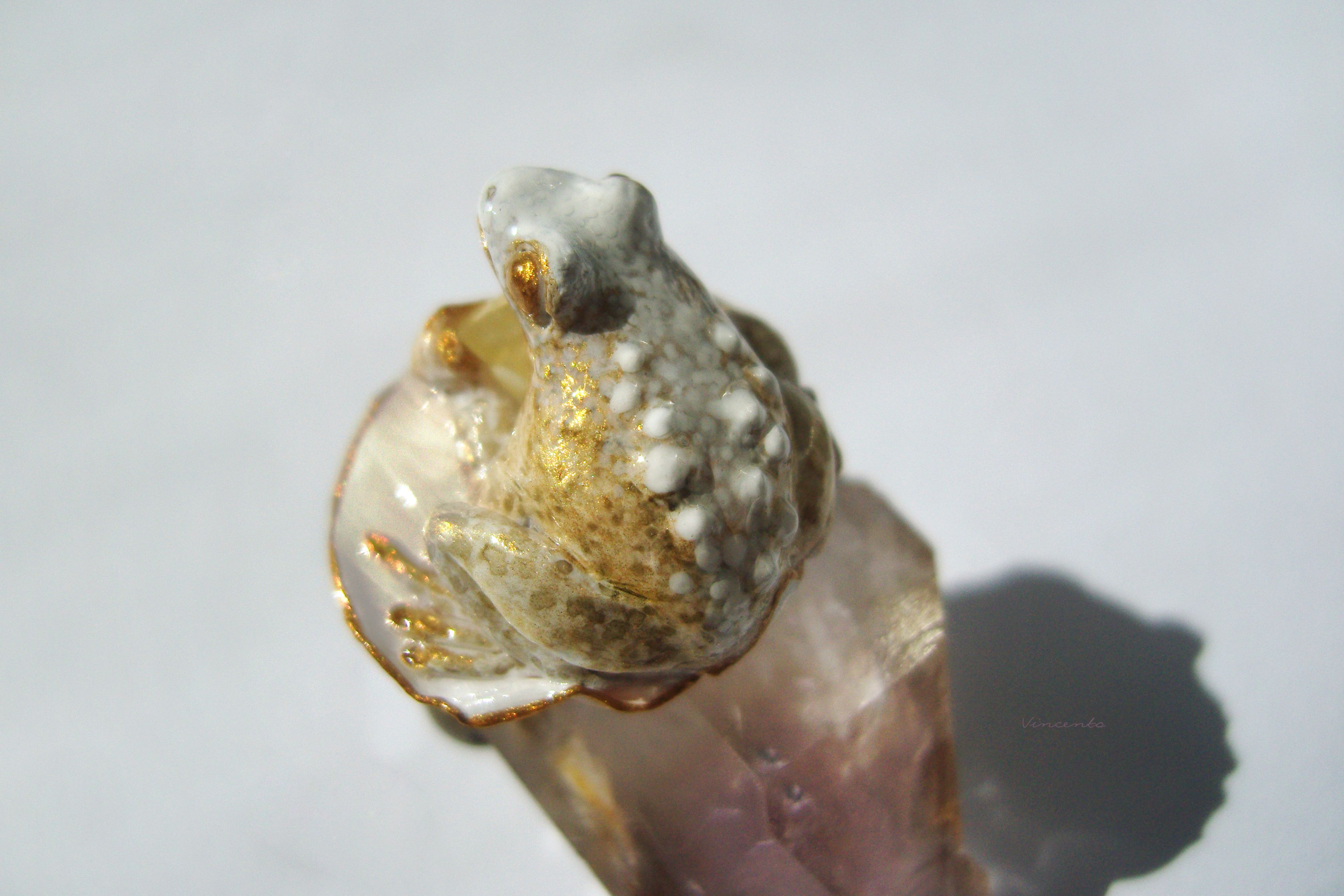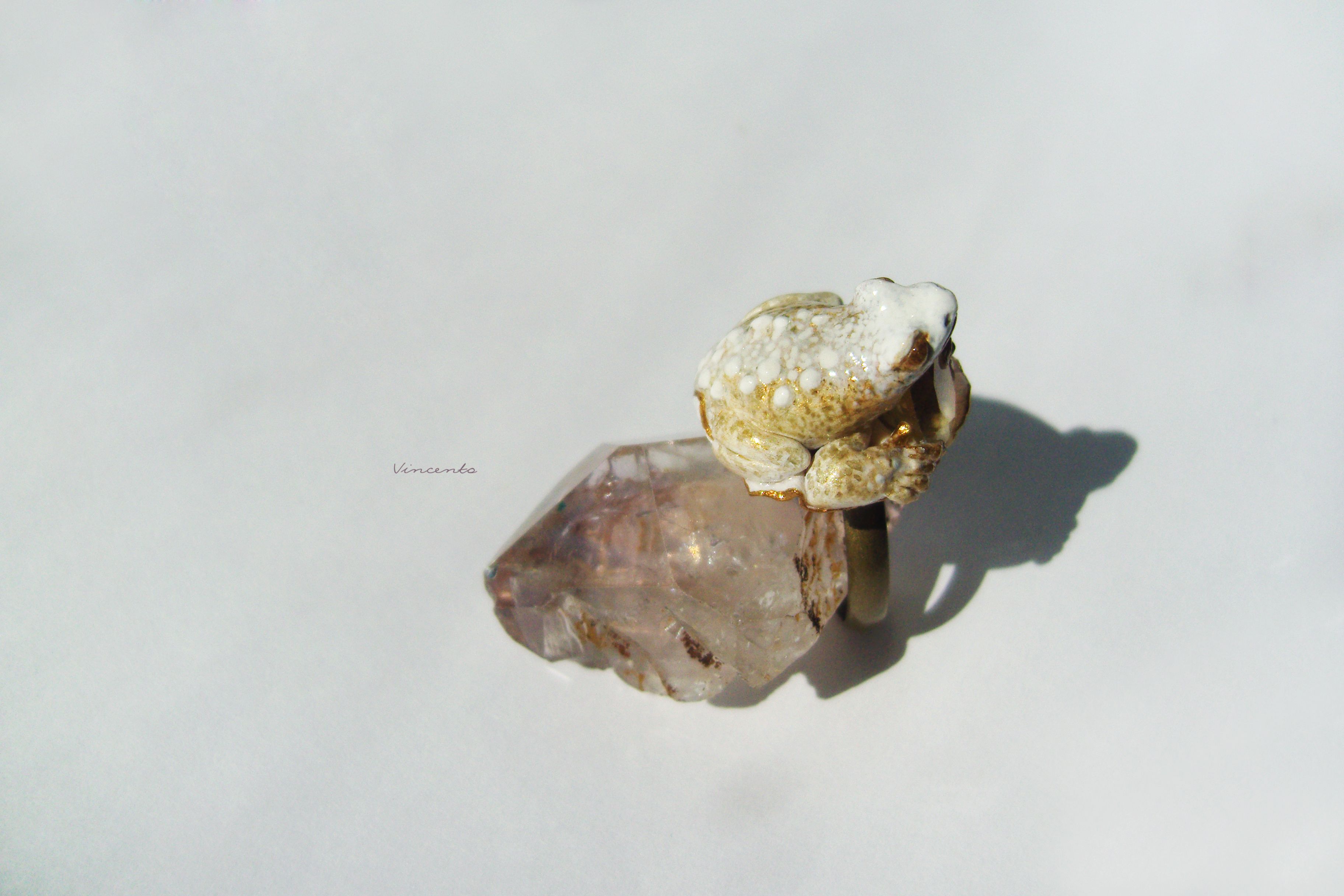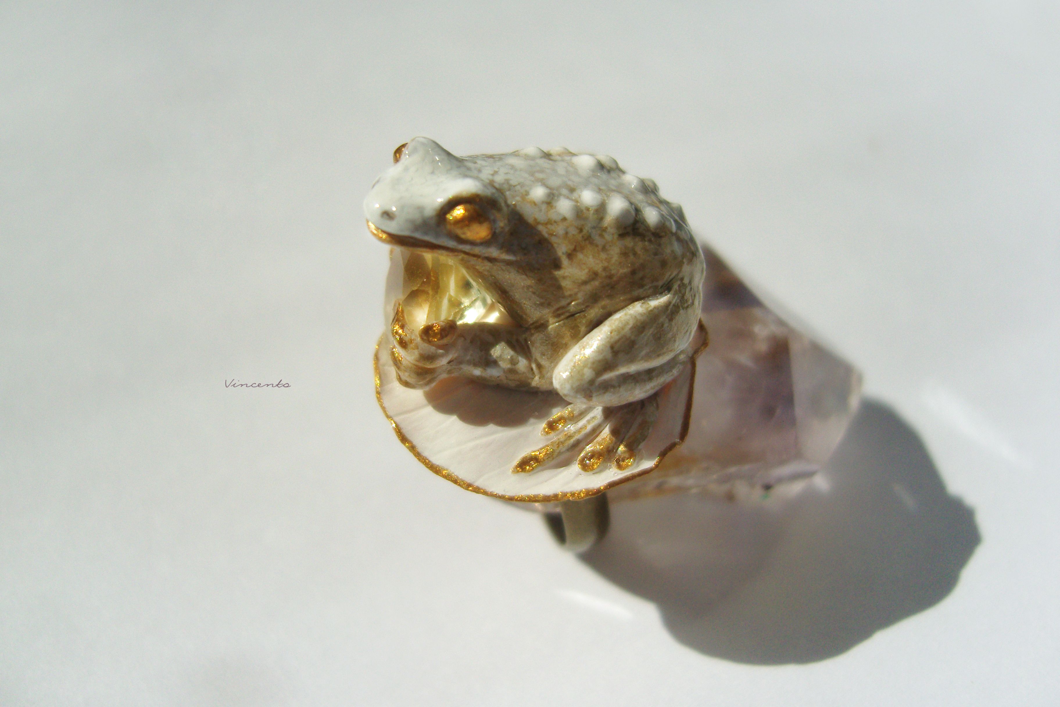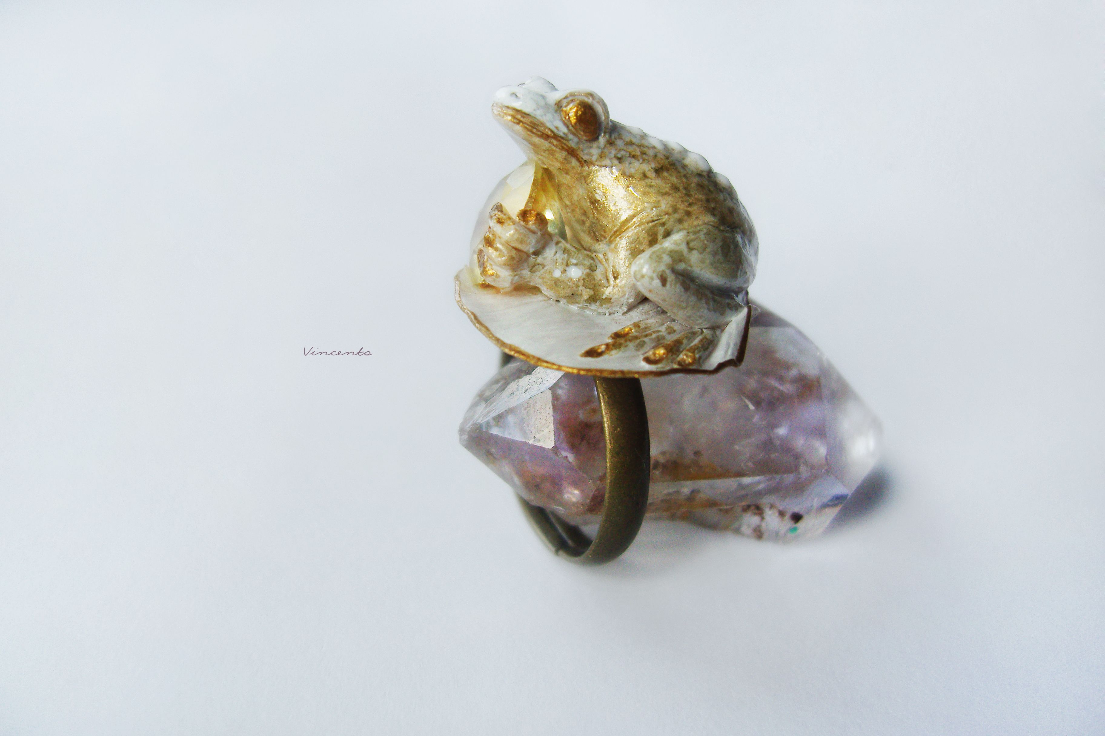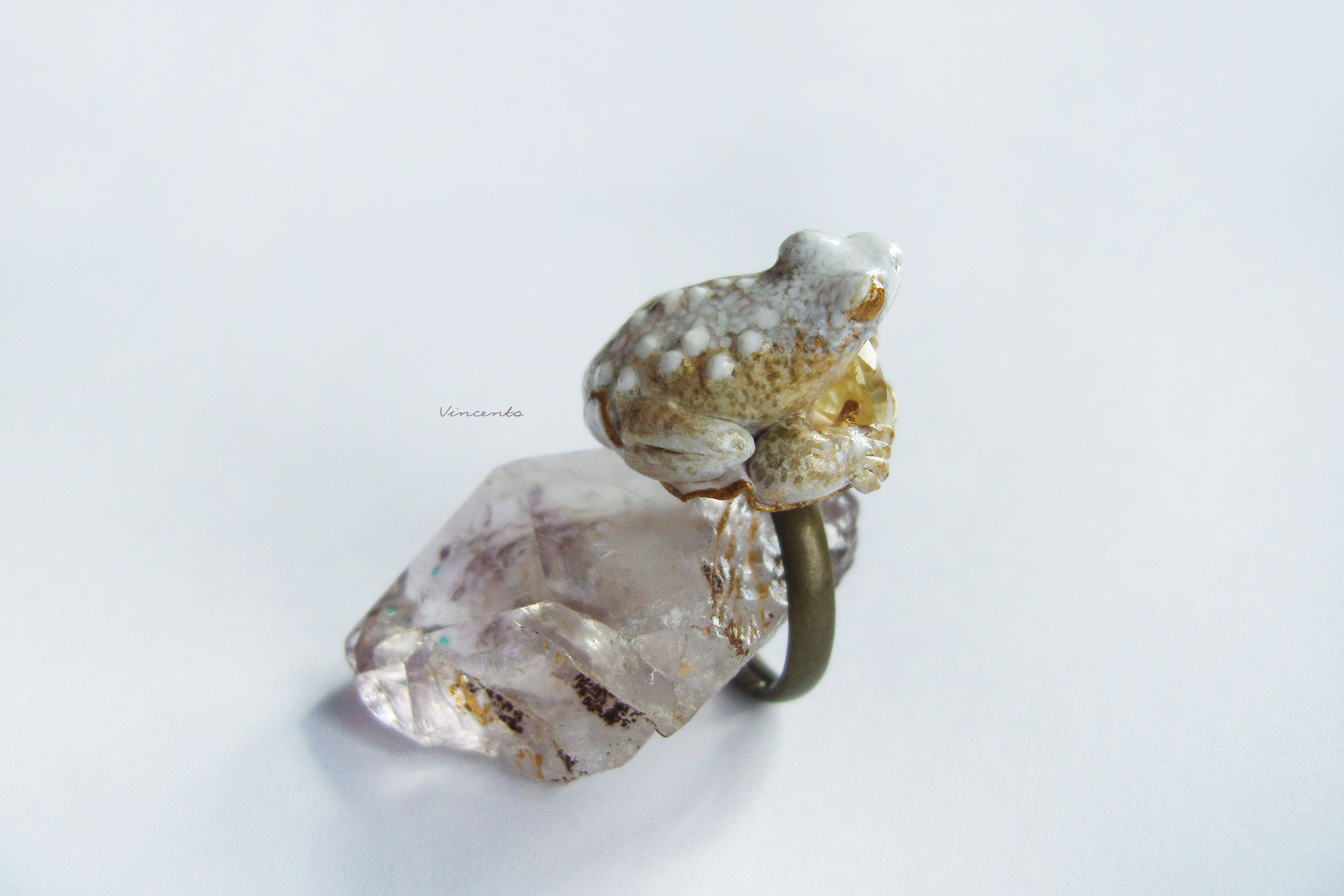 - Изящное фэнтезийное кольцо с золотистой лягушкой - зачарованным принцем из Солнечной Долины, - и камешком натурального кварца.