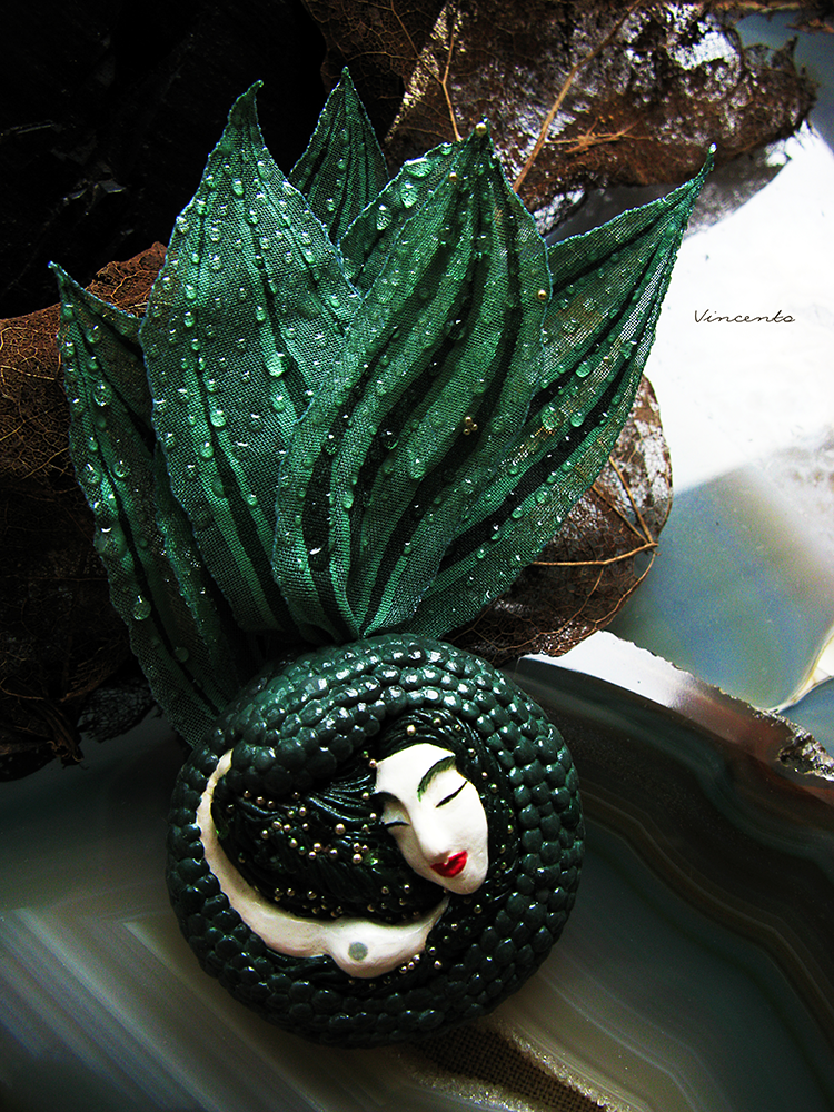 - "Спящая русалочка" выполнена из полимерной глины полностью вручную без использования каких-либо шаблонов или штампов! Роспись акриловой краской (+финишный лак на водной основе). Хвостовые плавники выполнены из тончайшего шёлка, украшенного кристально-прозрачными капельками (стекловидная масса). Замочек металлический, под бронзу. В волосах русалочки - мельчайшие золотистые крупинки - микробисер и прозрачные зелёные стёклышки, обточенные морскими волнами... Диаметр броши без плавников - около 3 см. Максимальная длина плавника - около 4,5 см.