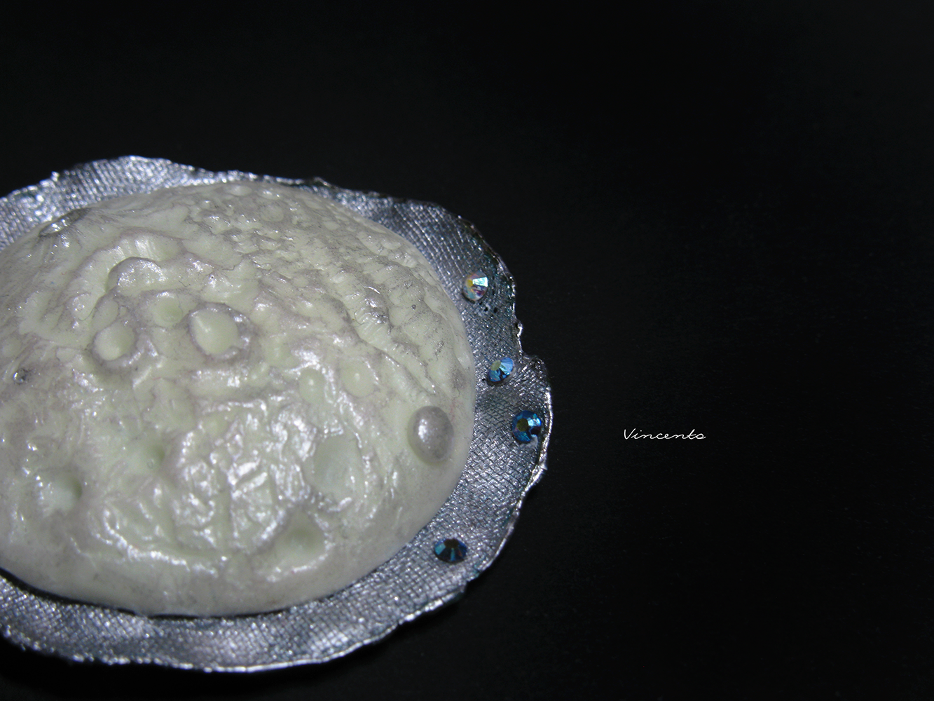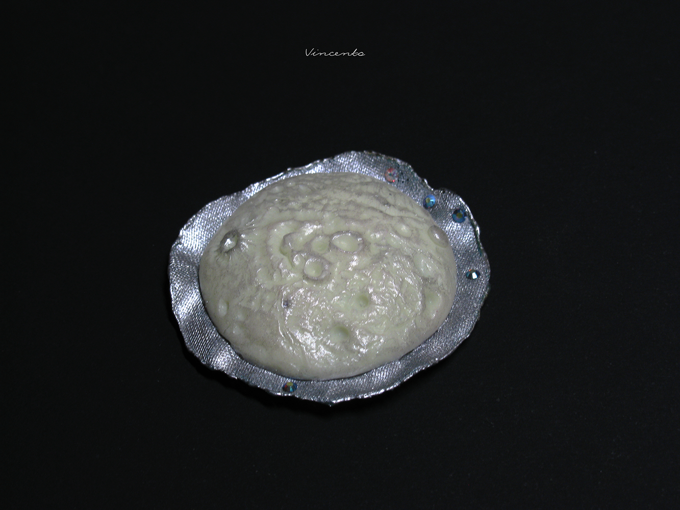 - Материалы: фосфорицирующая термоглина, органза, акрил, лак, стразы Сваровски, металлическая фурнитура.