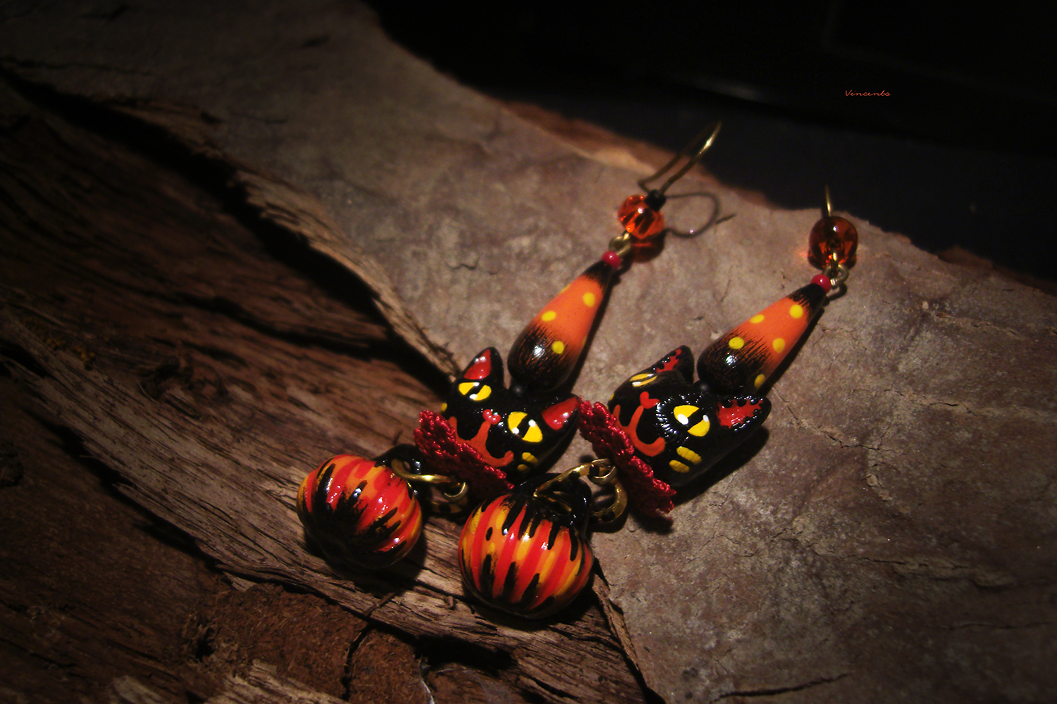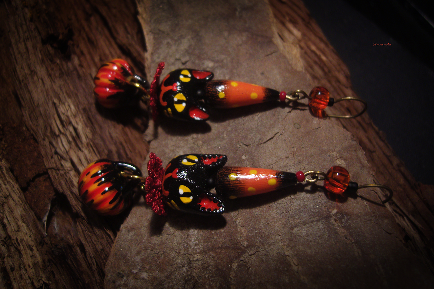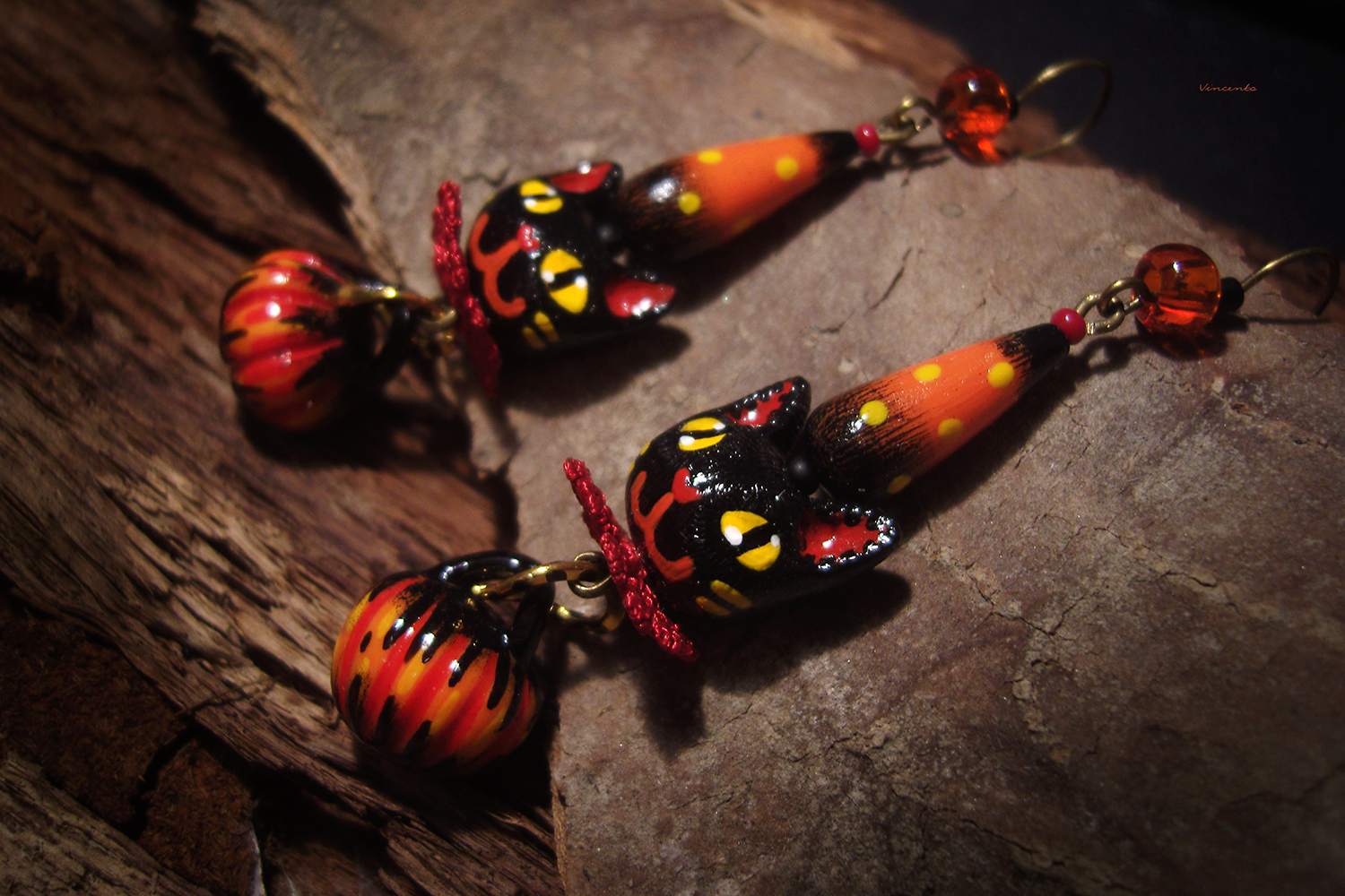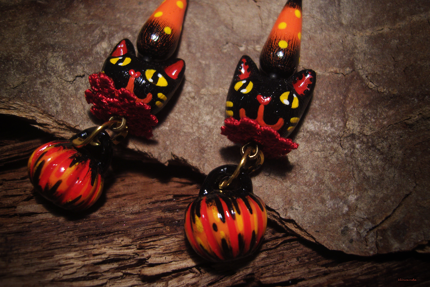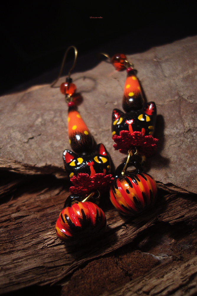 - Необычные фэнтези-серьги, стилизованные под винтажные ёлочные игрушки, с подвесками-кошечками, чёрными, как непроглядная ночь, огненно-рыжими тыковками, цирковыми конусами и янтарными бусинками чешского стекла.