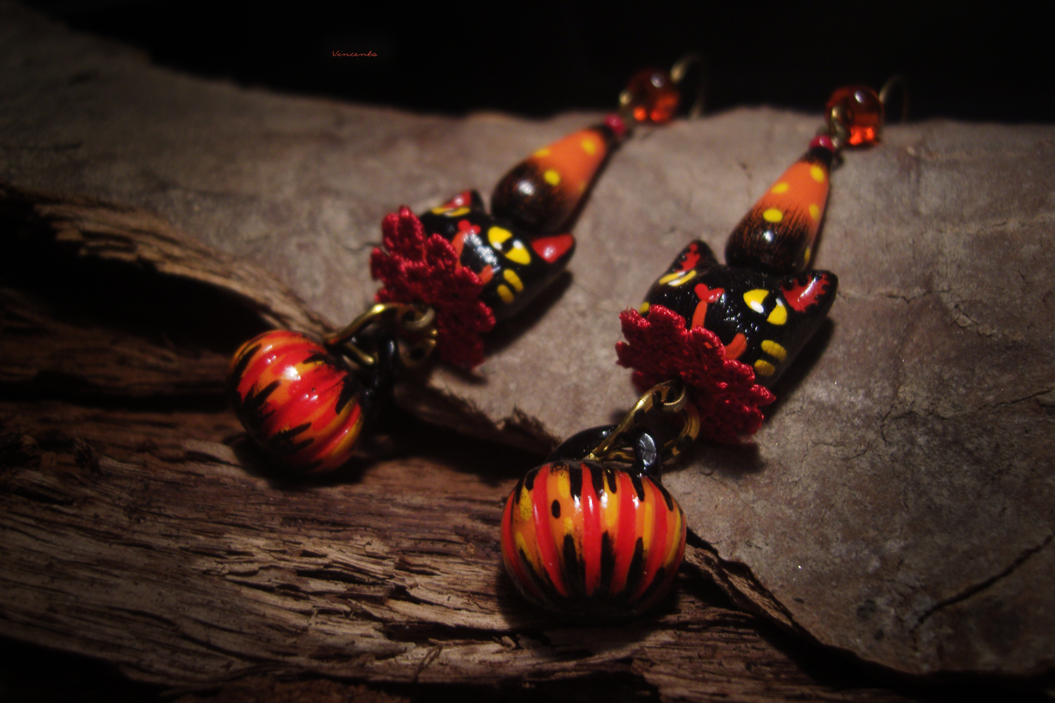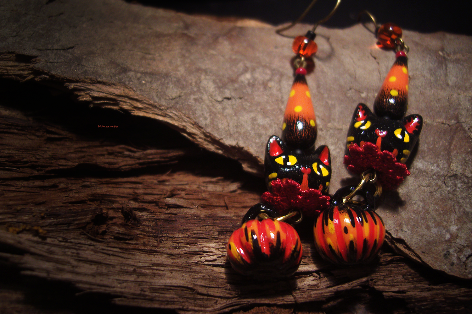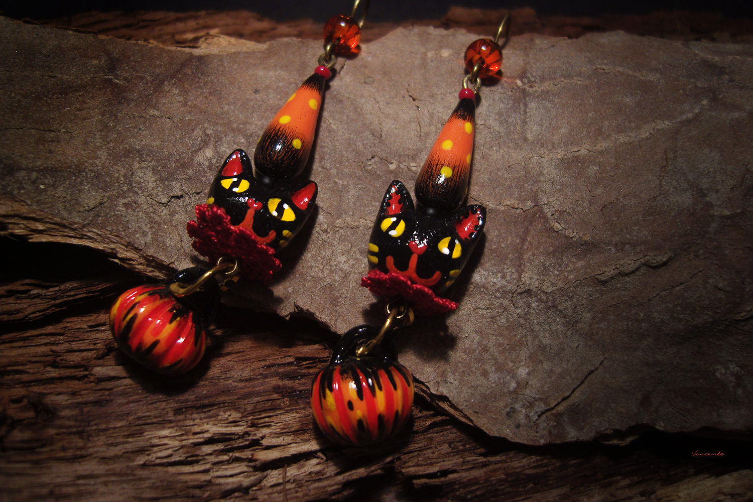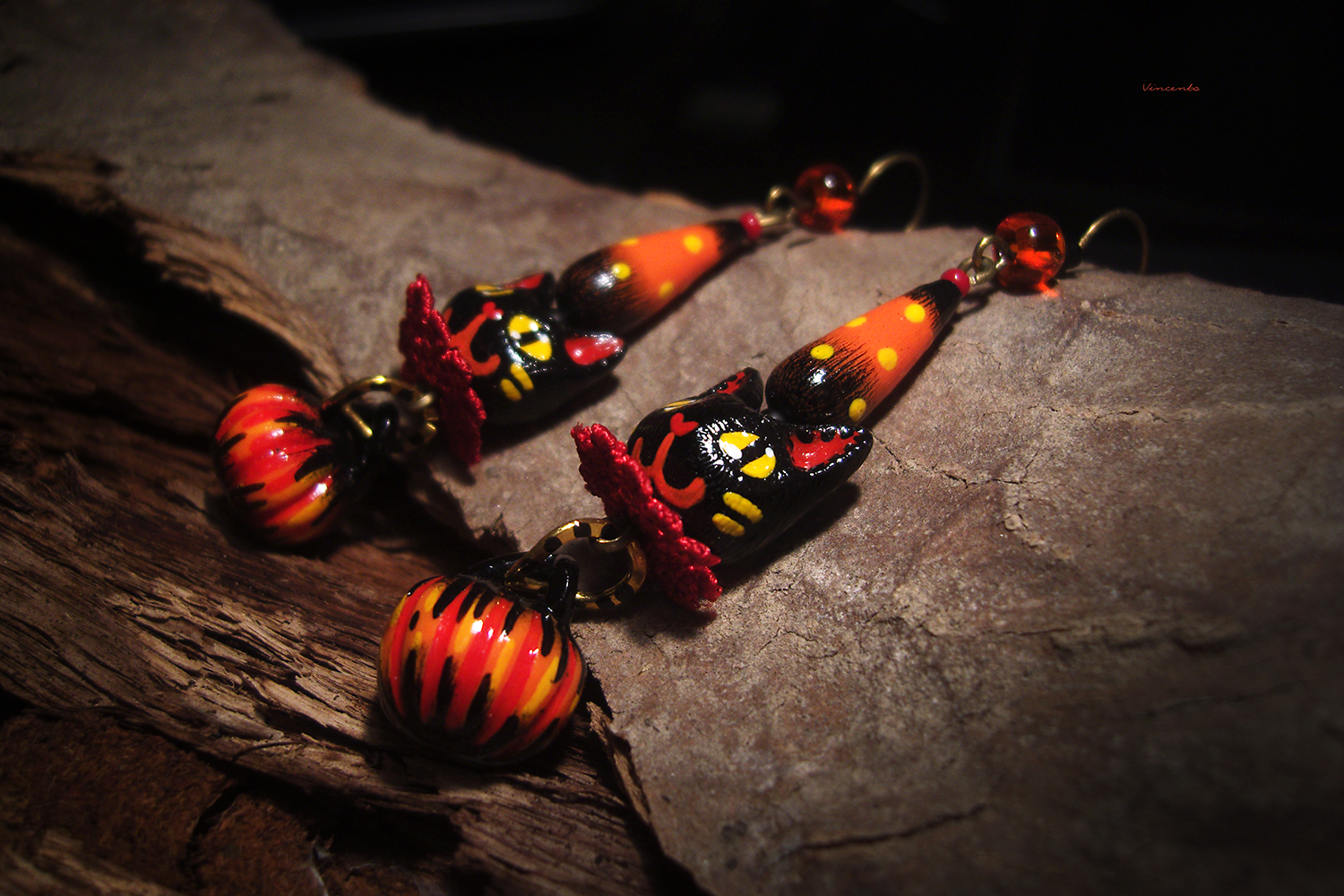 - Необычные фэнтези-серьги, стилизованные под винтажные ёлочные игрушки, с подвесками-кошечками, чёрными, как непроглядная ночь, огненно-рыжими тыковками, цирковыми конусами и янтарными бусинками чешского стекла.