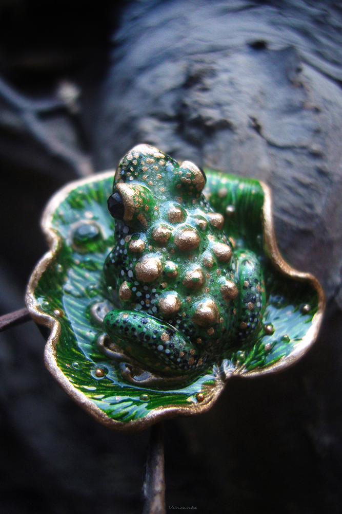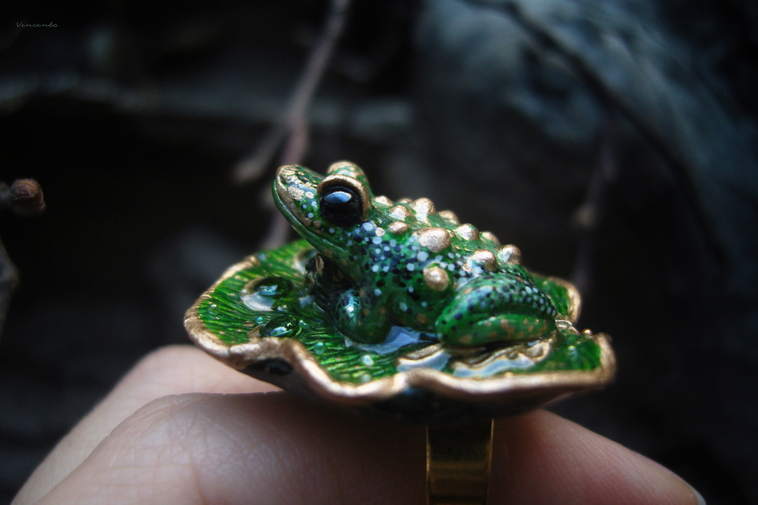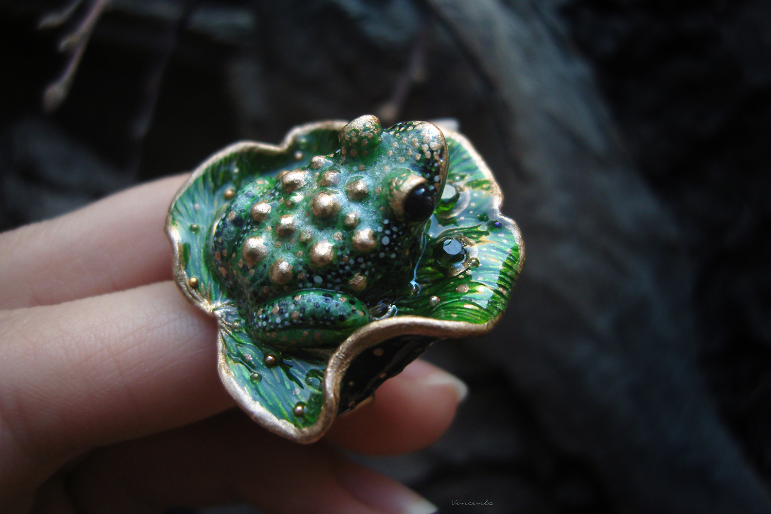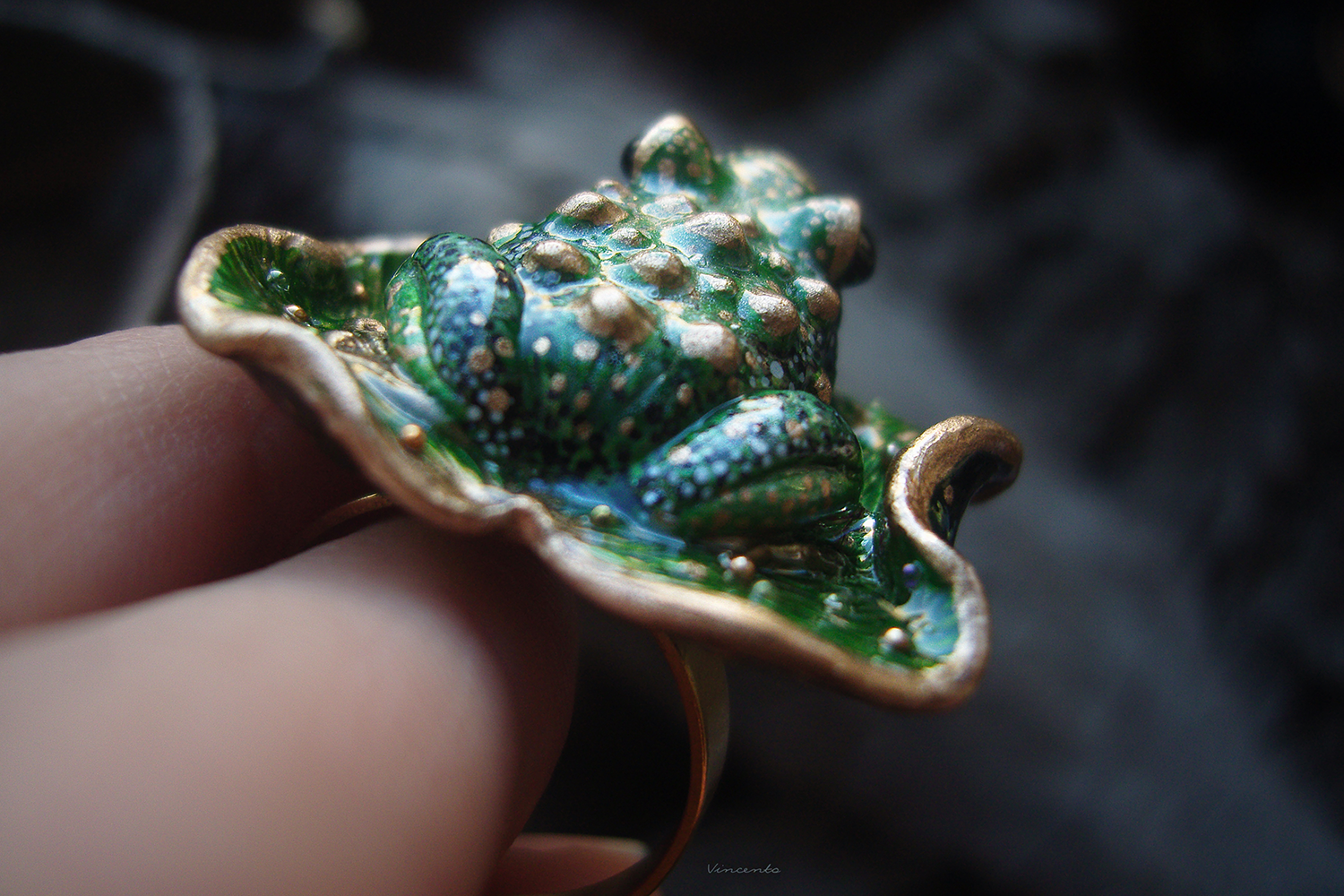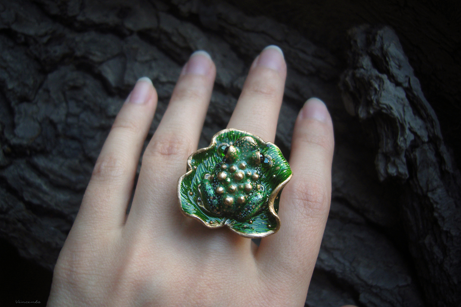 - Коллекционное колечко насыщенного зелёного оттенка с золотой тонировкой в виде фэнтезийной травяной инфанты, принцессы-лягушки на крупном листе кувшинки с гранёными камешками сибирского изумруда.