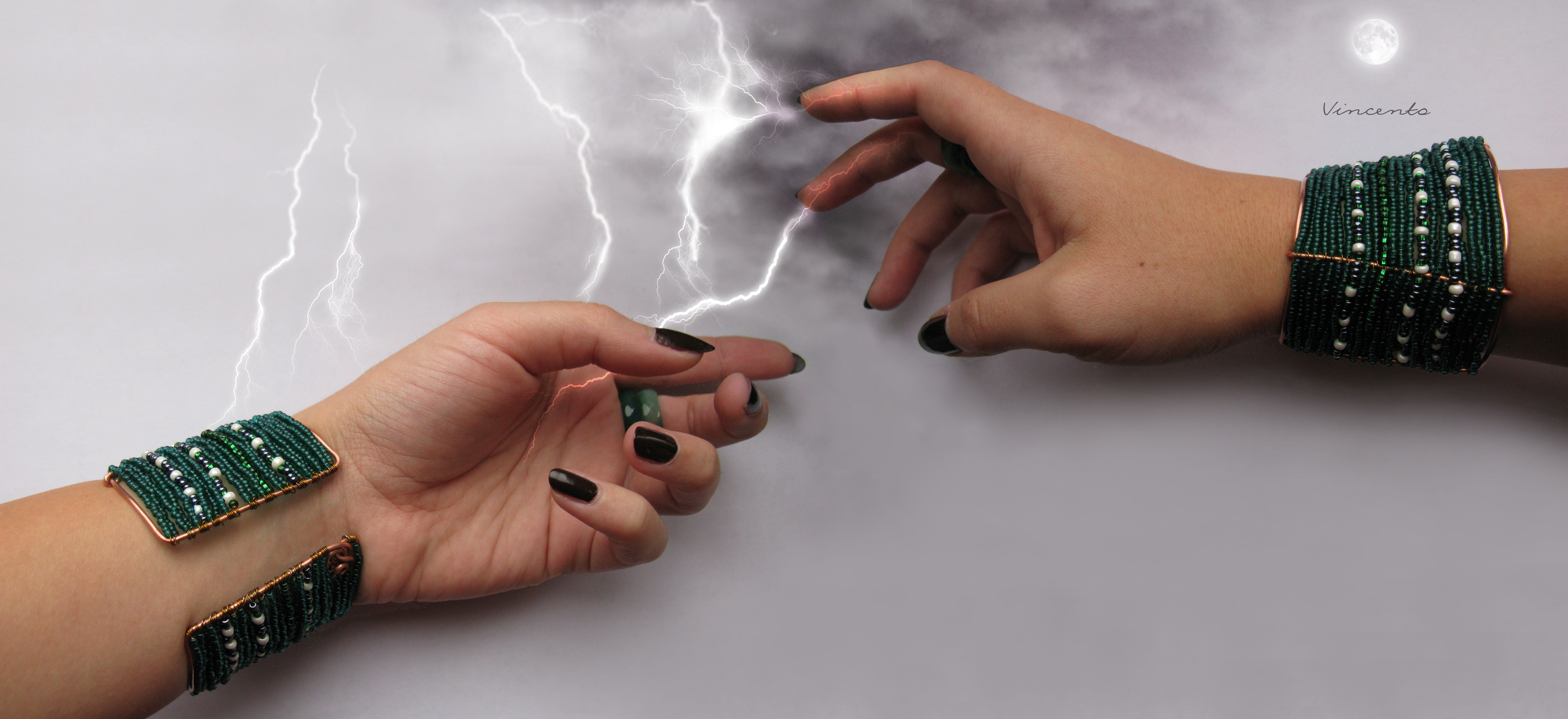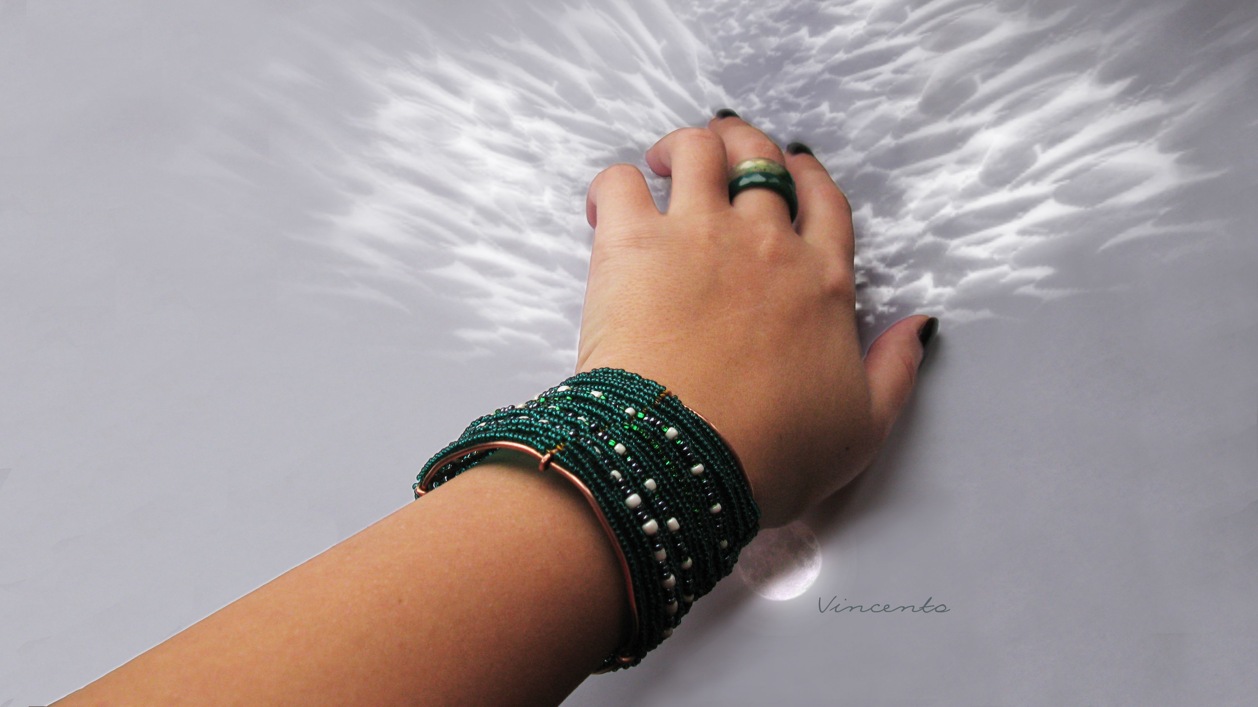 - Браслет сплетён полностью вручную на основе медной фурнитуры и чешского бисера нескольких видов: аккуратных бусин мистического зелёного оттенка, ярко-зелёных, серых и перламутровых вставок.