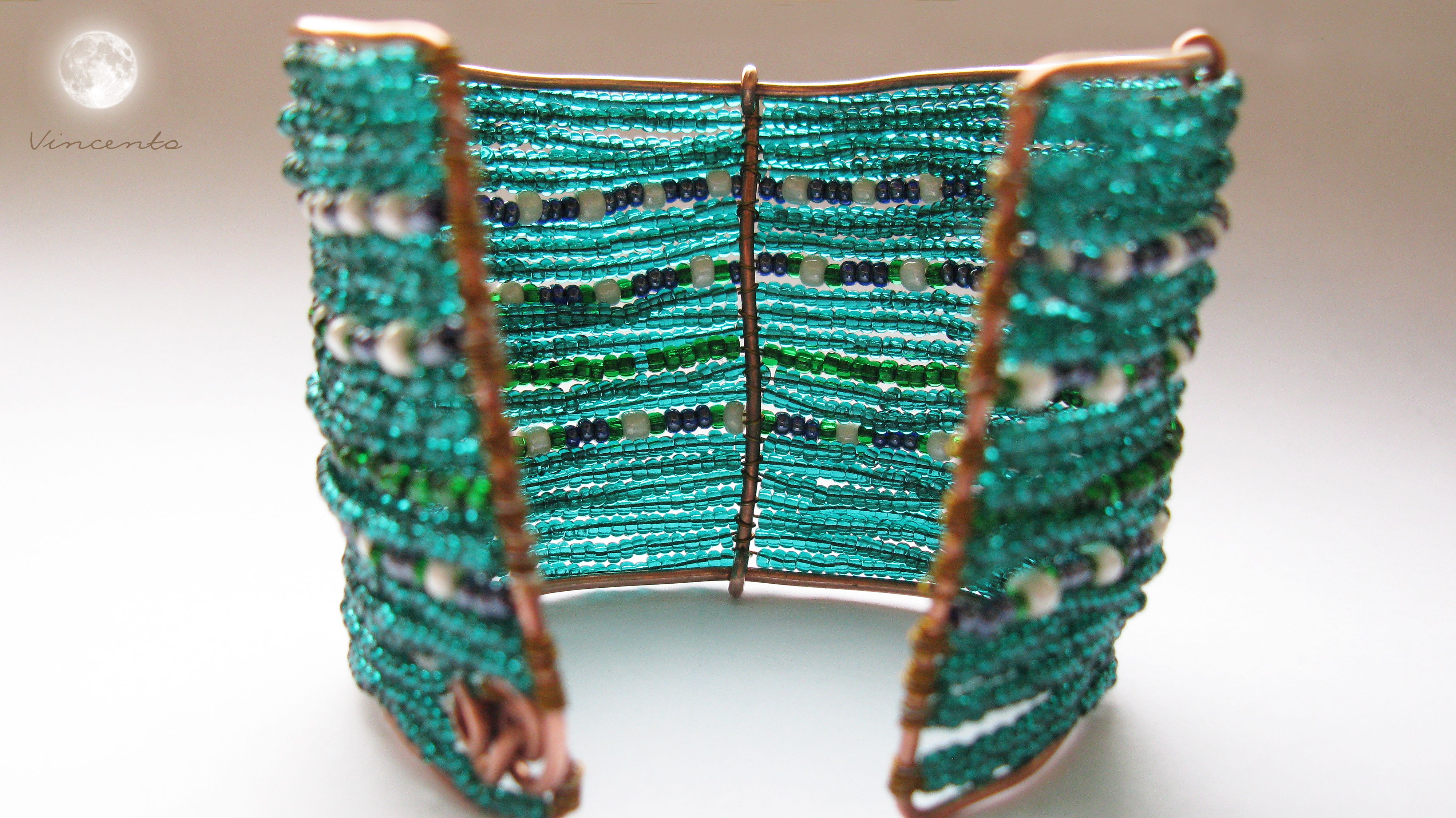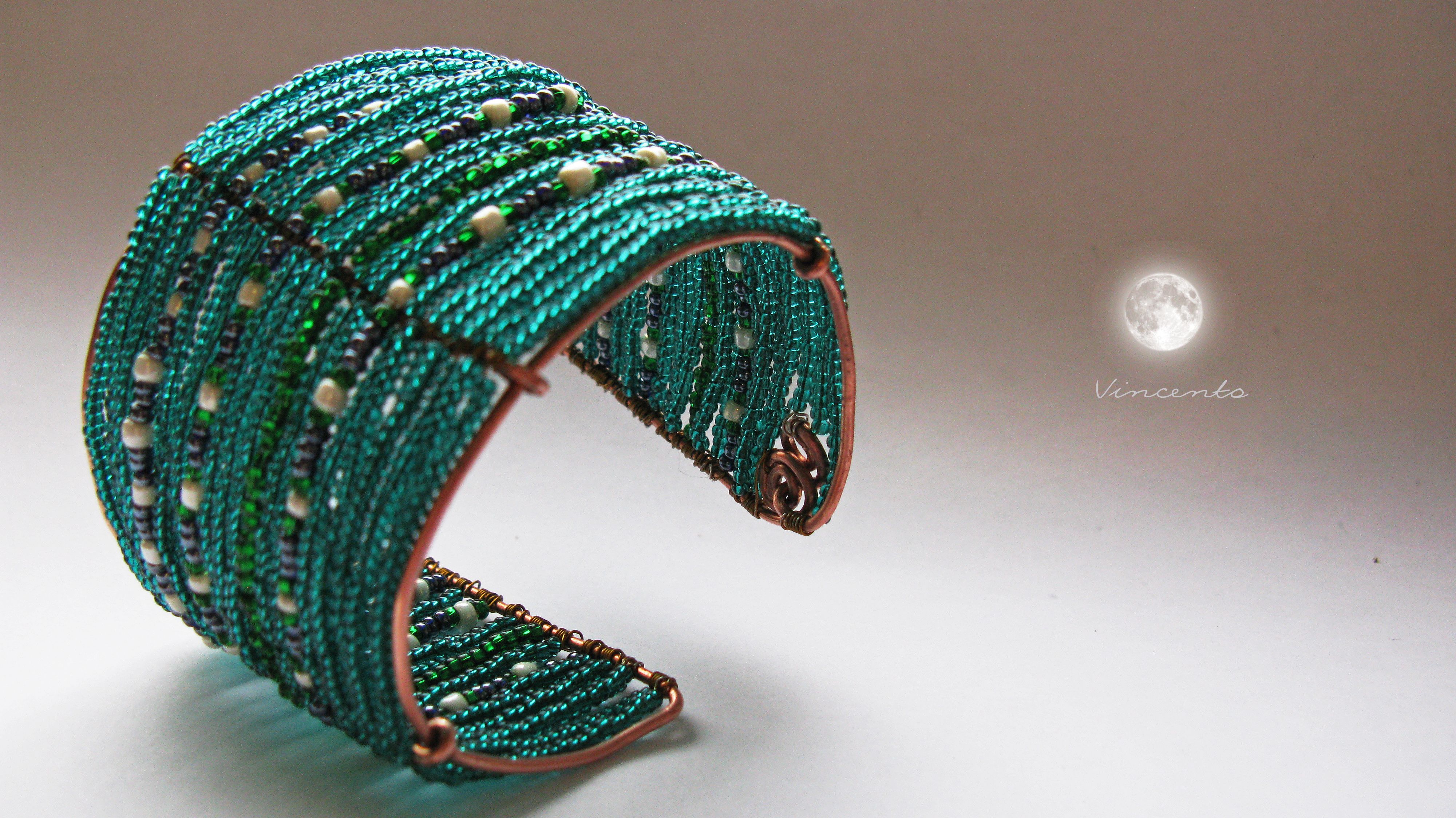 - Красивый широкий браслет в этническом стиле из чешского бисера глубокого изумрудного оттенка и медной проволоки.
