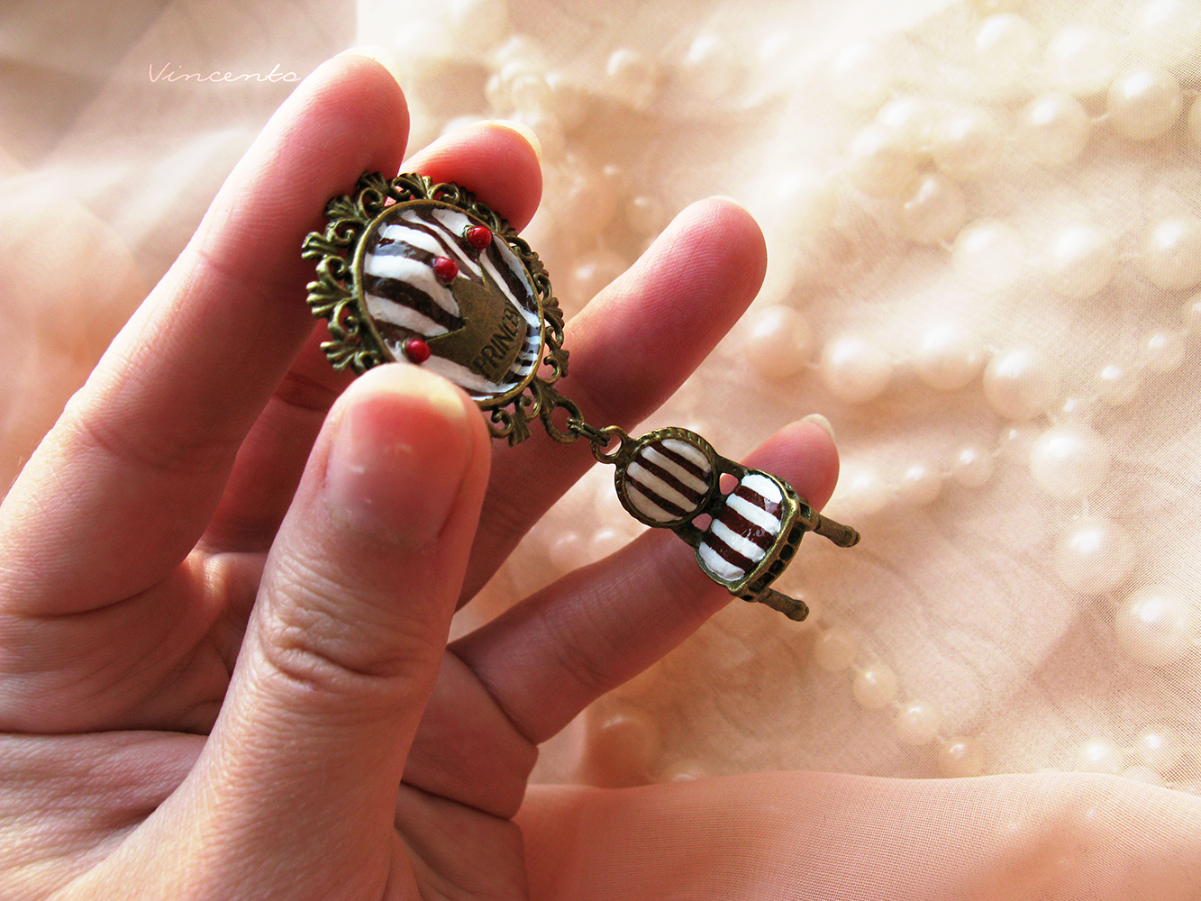 - Материалы: металлическая фрунитура, папье-маше, акриловые краски, лак на водной основе, чешский бисер.