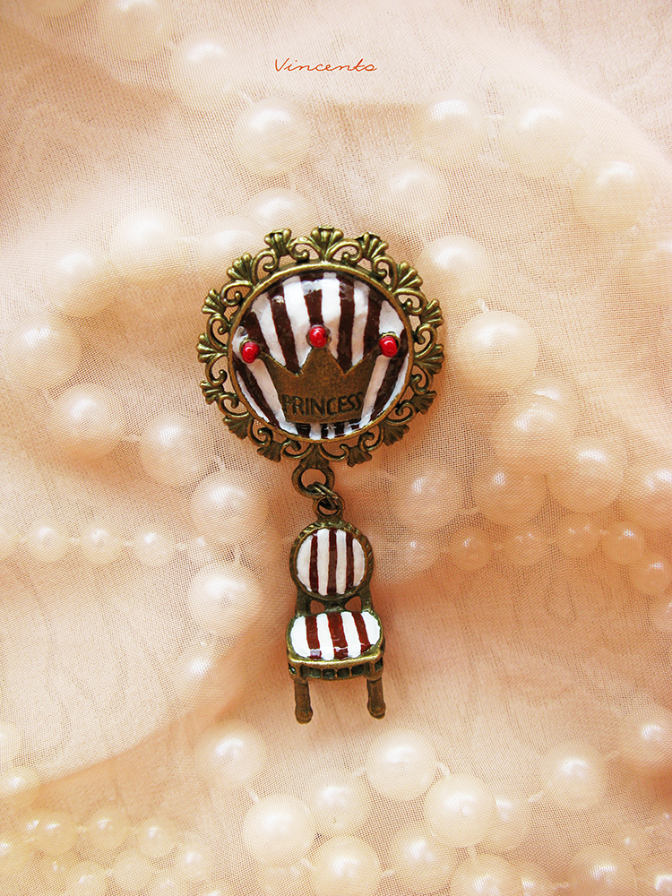 - Необычная брошь в виде королевского трона, оформленного и расписанного вручную.