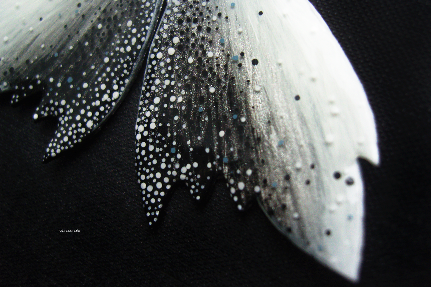 - Цветовая гамма построена на сочетании чёрного, белого и серебряного, с крошечными голубыми крапинками.