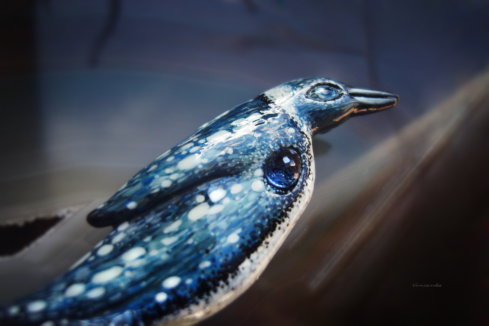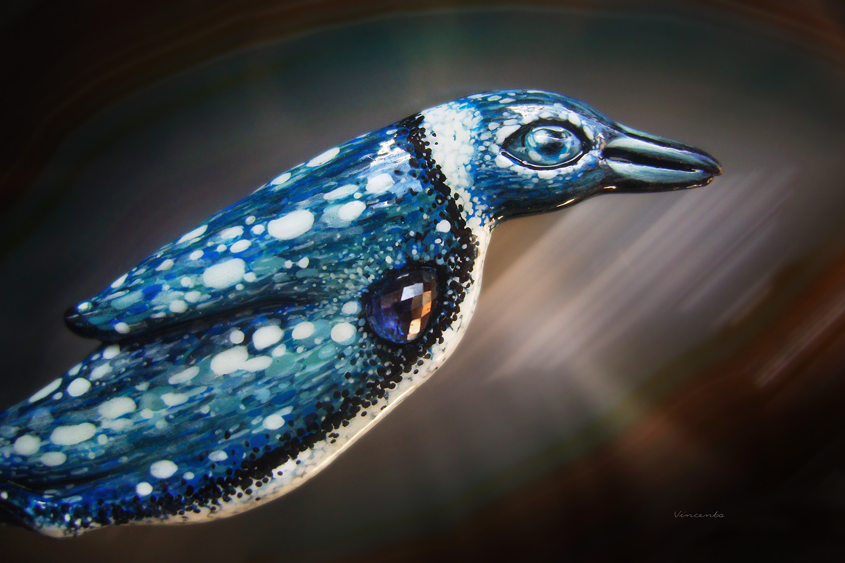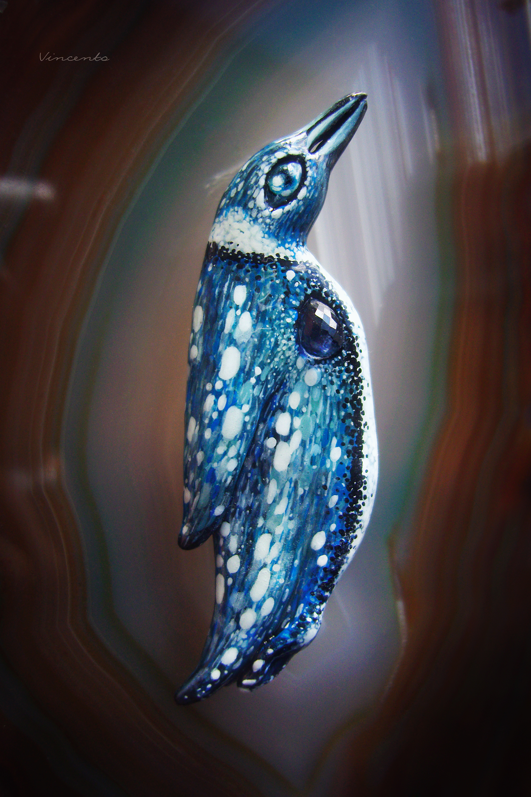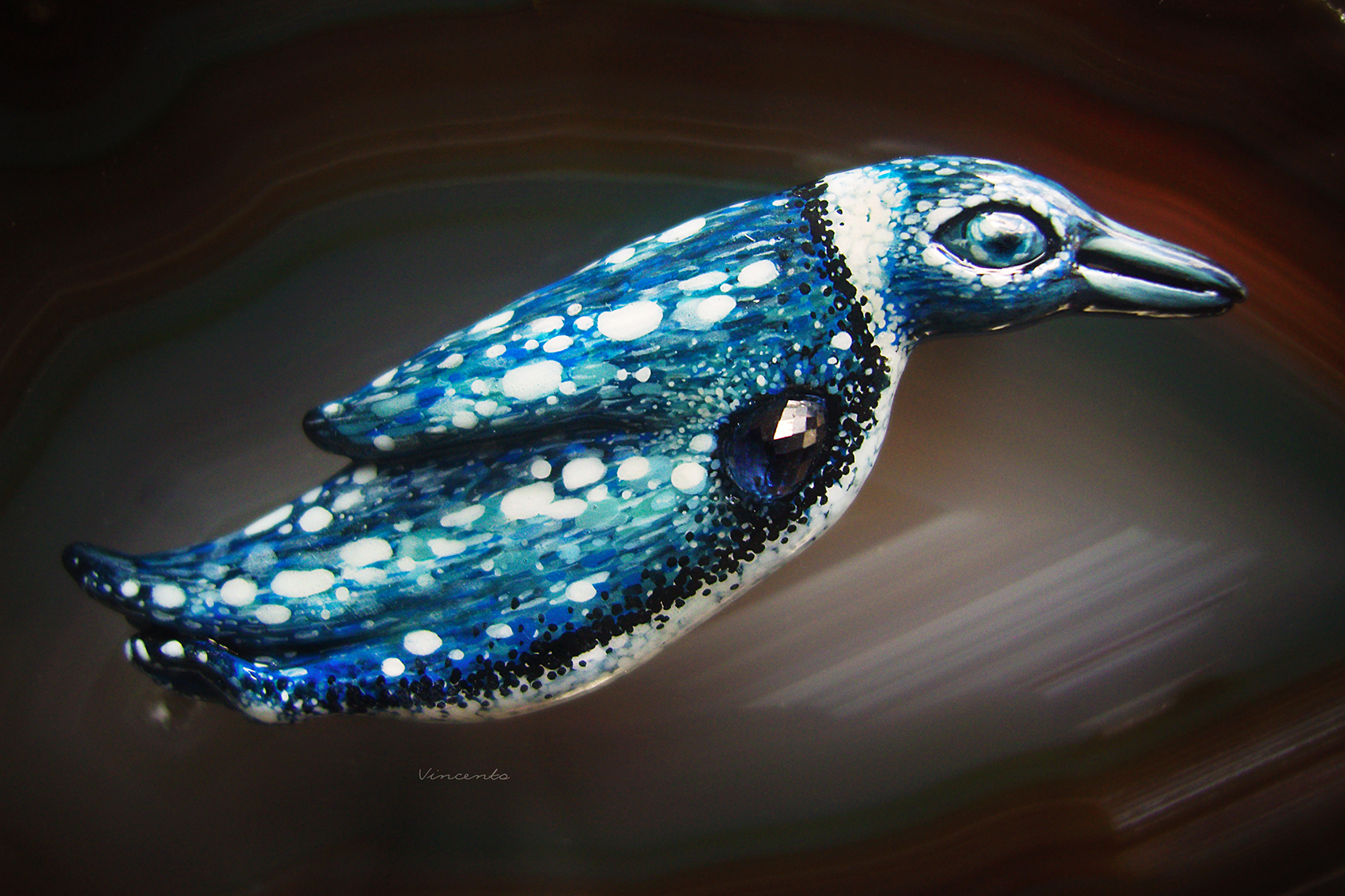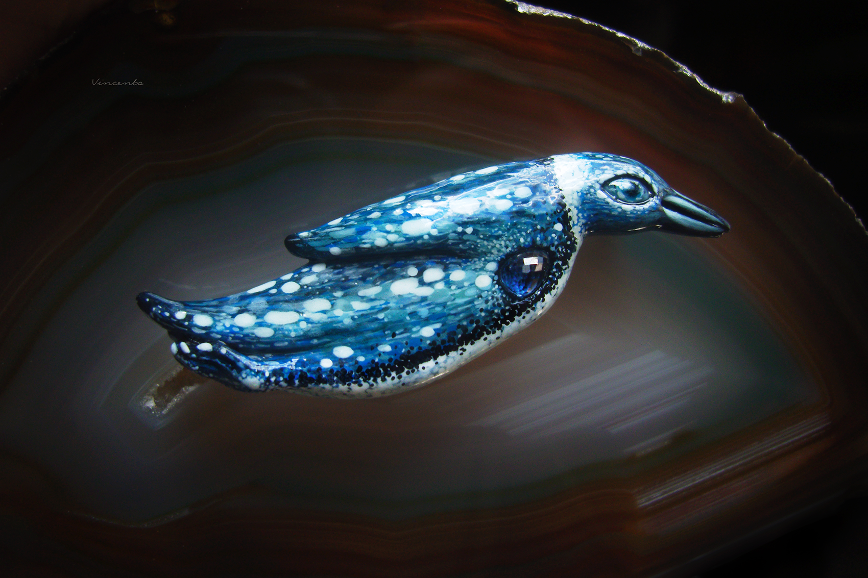 - Миниатюрная брошка в виде волшебной Заполярной птицы, пингвина Мерилии, украшенная гранёной капелькой натурального тёмно-синего сапфира.