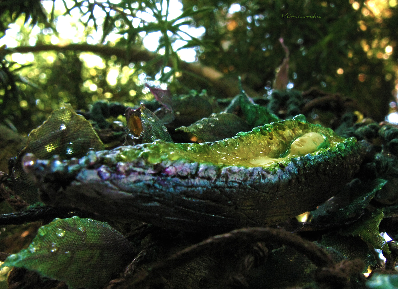 - Сложное по композиции и цвету украшение. Само колье тщательно сплетено в сложный узор, напоминающий запутавшиеся ветви деревьев; полупрозрачные листочки из тончайшего шёлка тонированы зелёными и фиолетовыми оттенками, а кристально-чистые капли выхватывают малейшие блики света, делая колье "живым" и искристым.