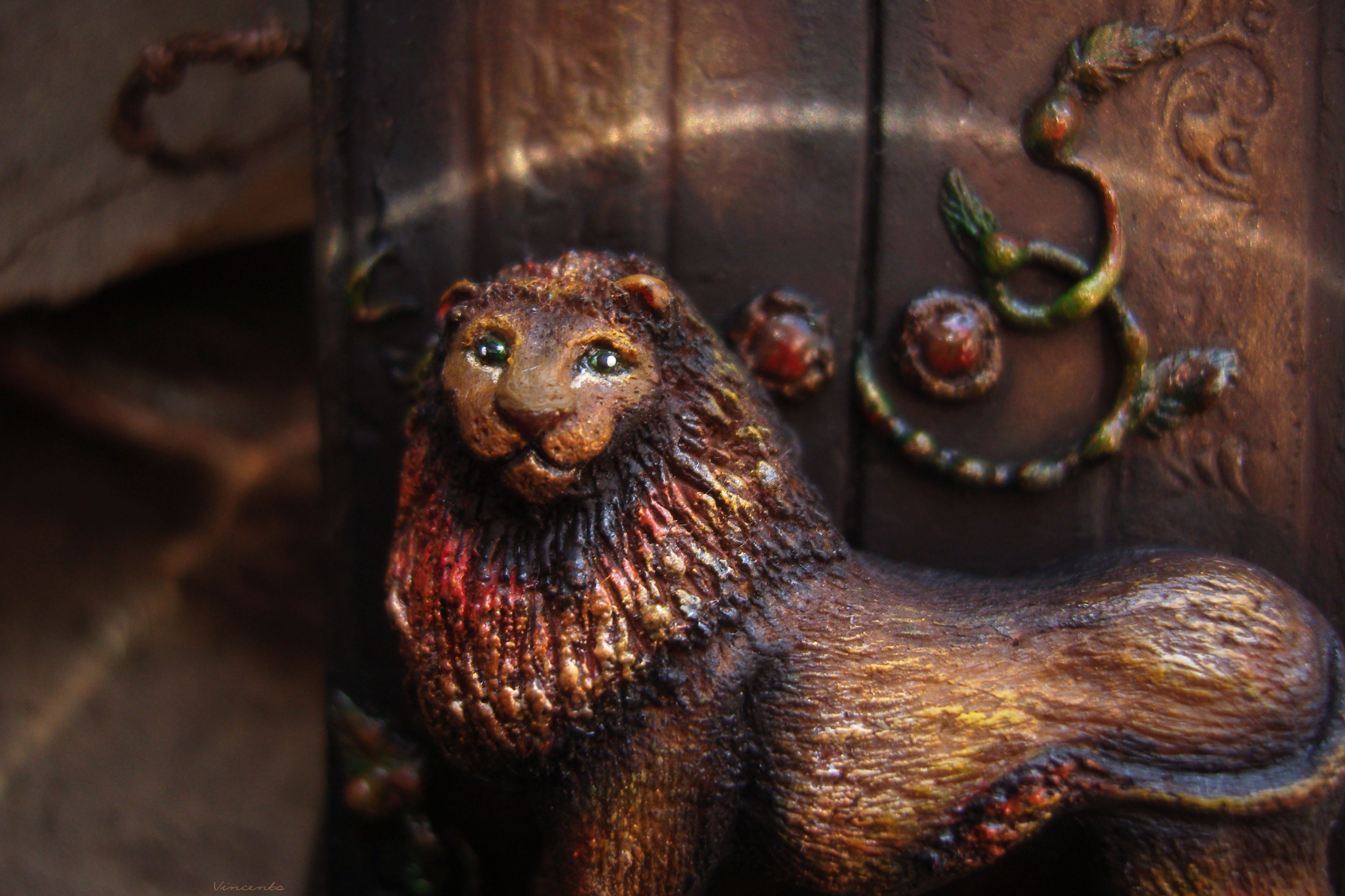 - Пышное, нарядное колье по мотивам "Хроник Нарнии" Клайва Льюиса с подвеской в виде льва Аслана и платяного шкафа.