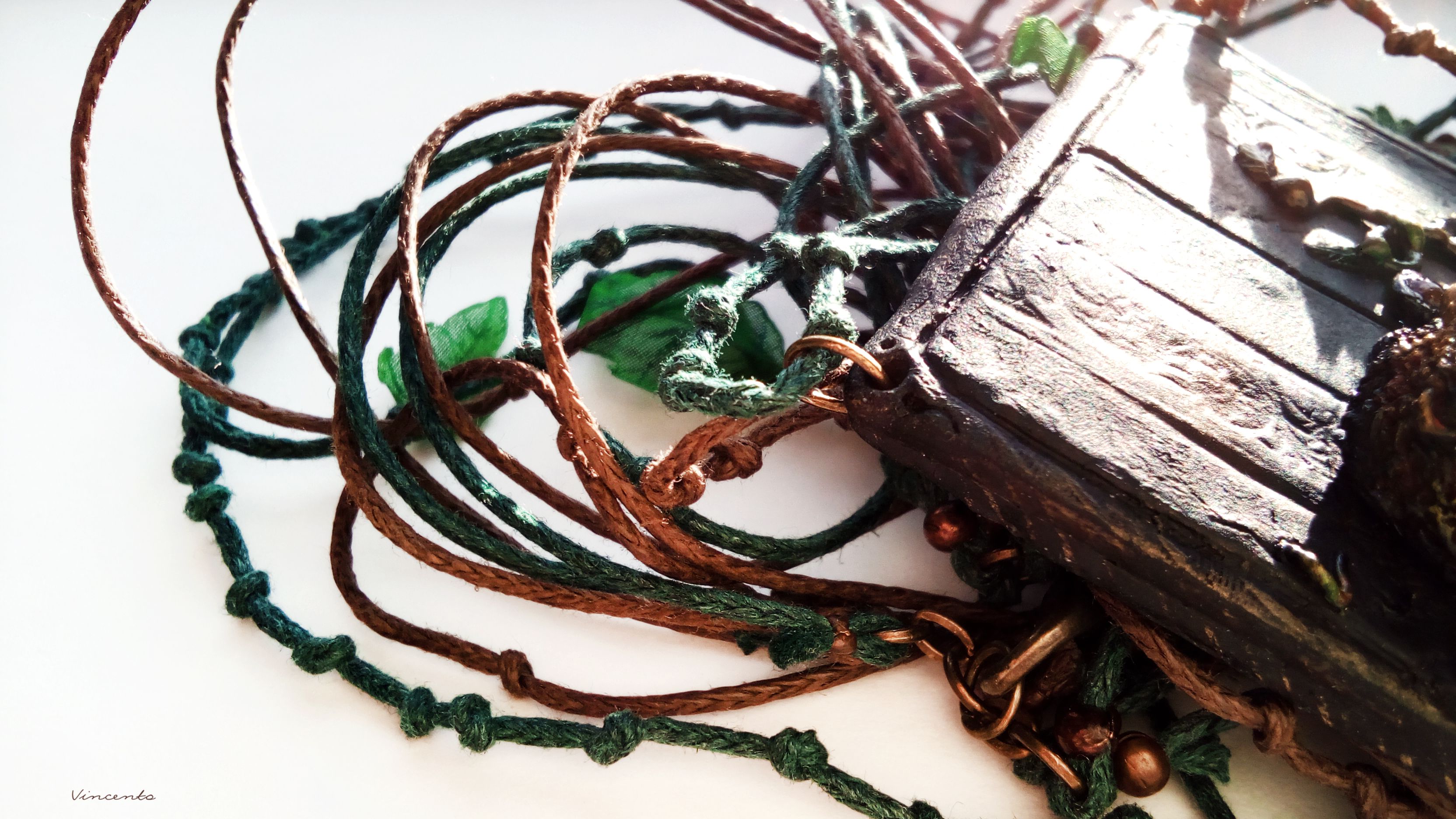 - Само колье сплетено наподобие лесных веточек из цветных вощёных шнуров, дополненных сочными листочками из тончайшего шёлка.