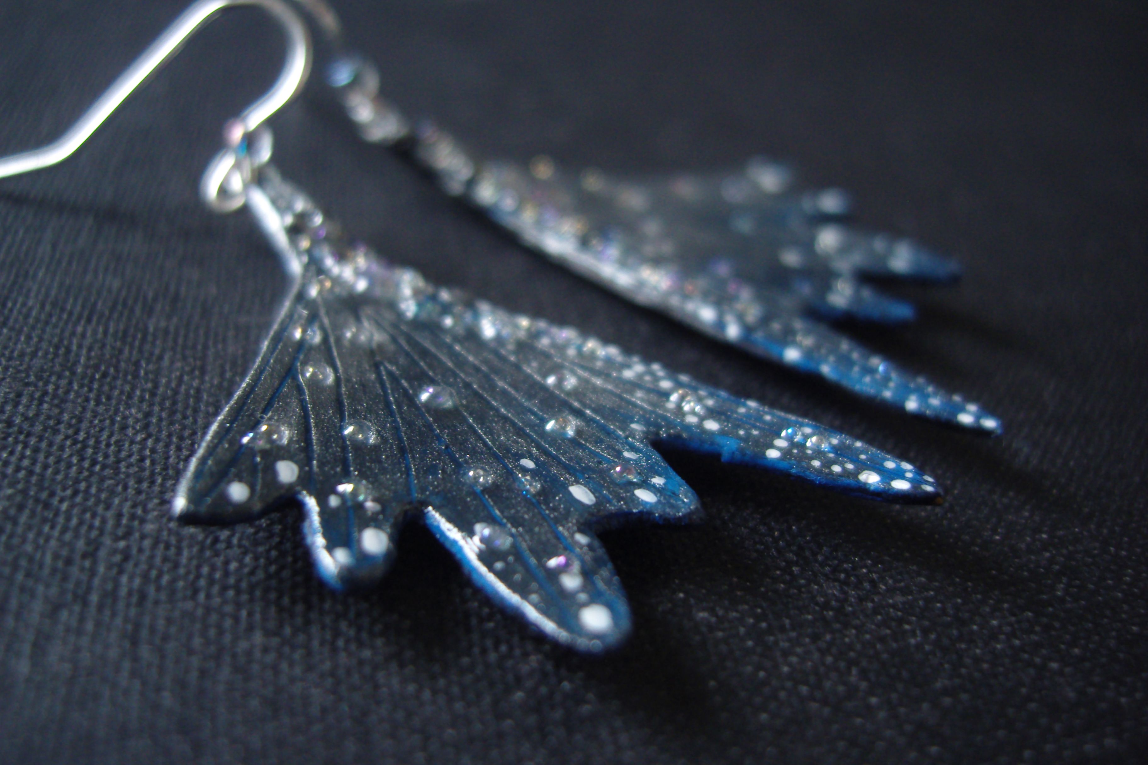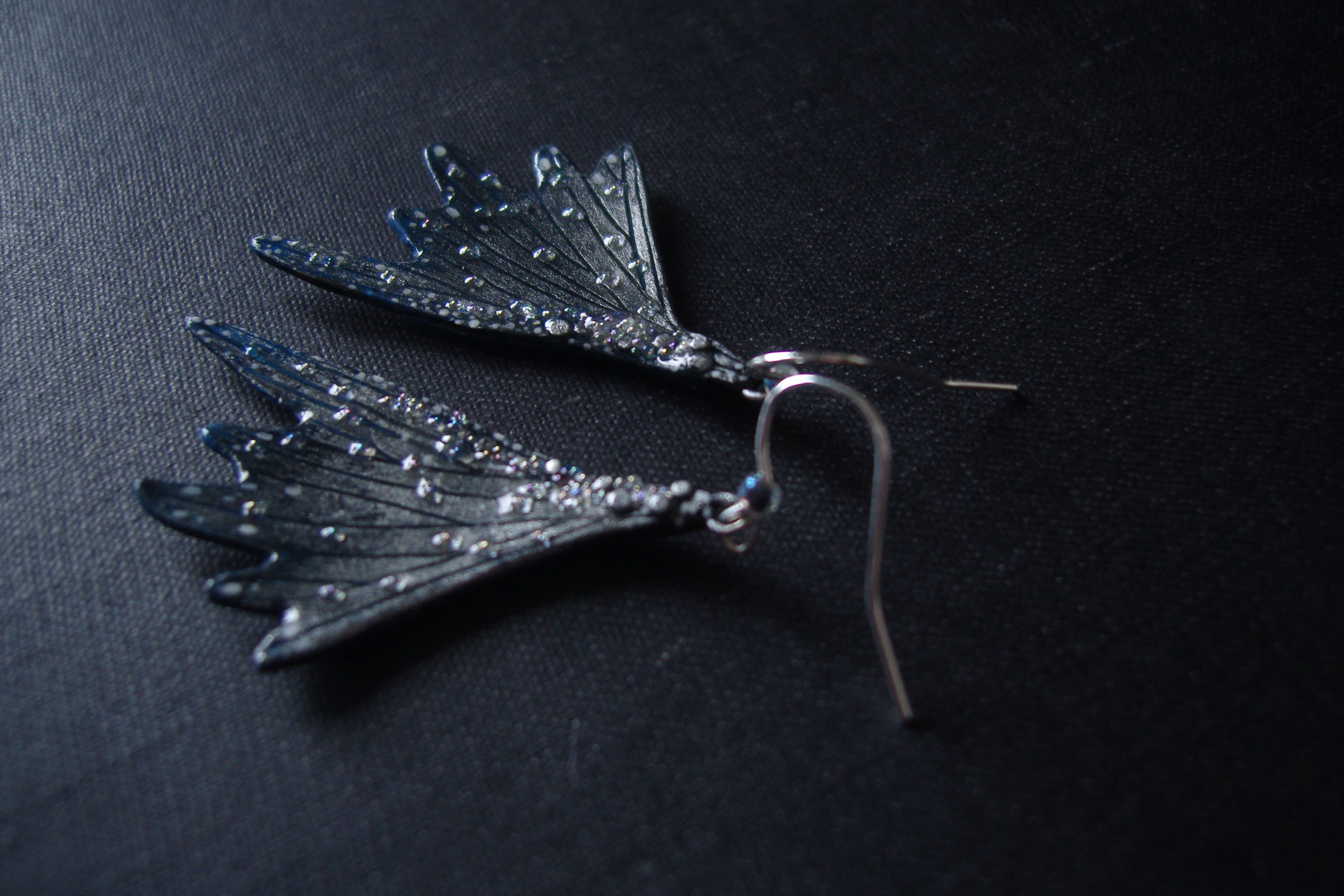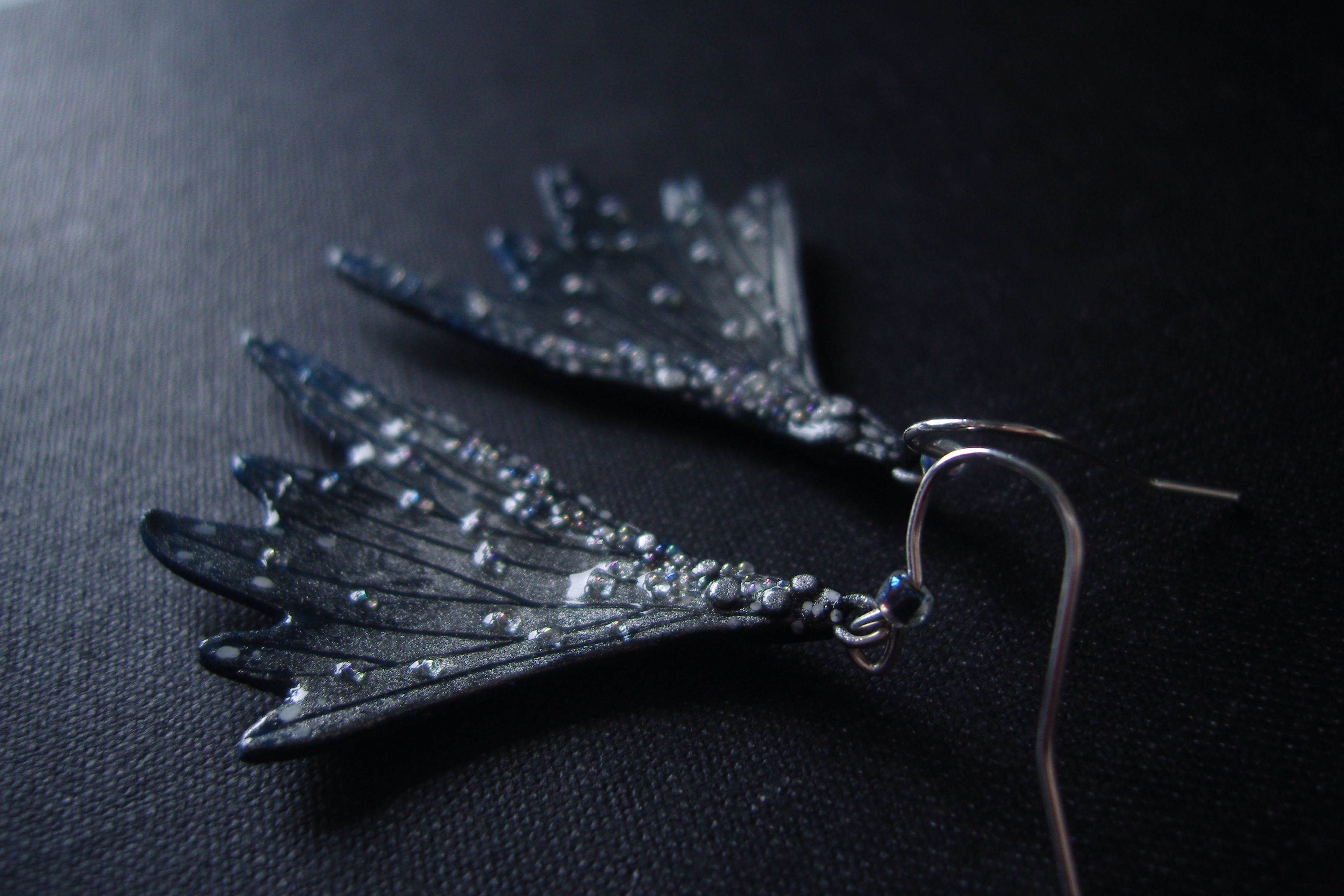 - Мистические серьги-крылышки в тёмной, серебристо-синей цветовой гамме, с чешским и микробисером.