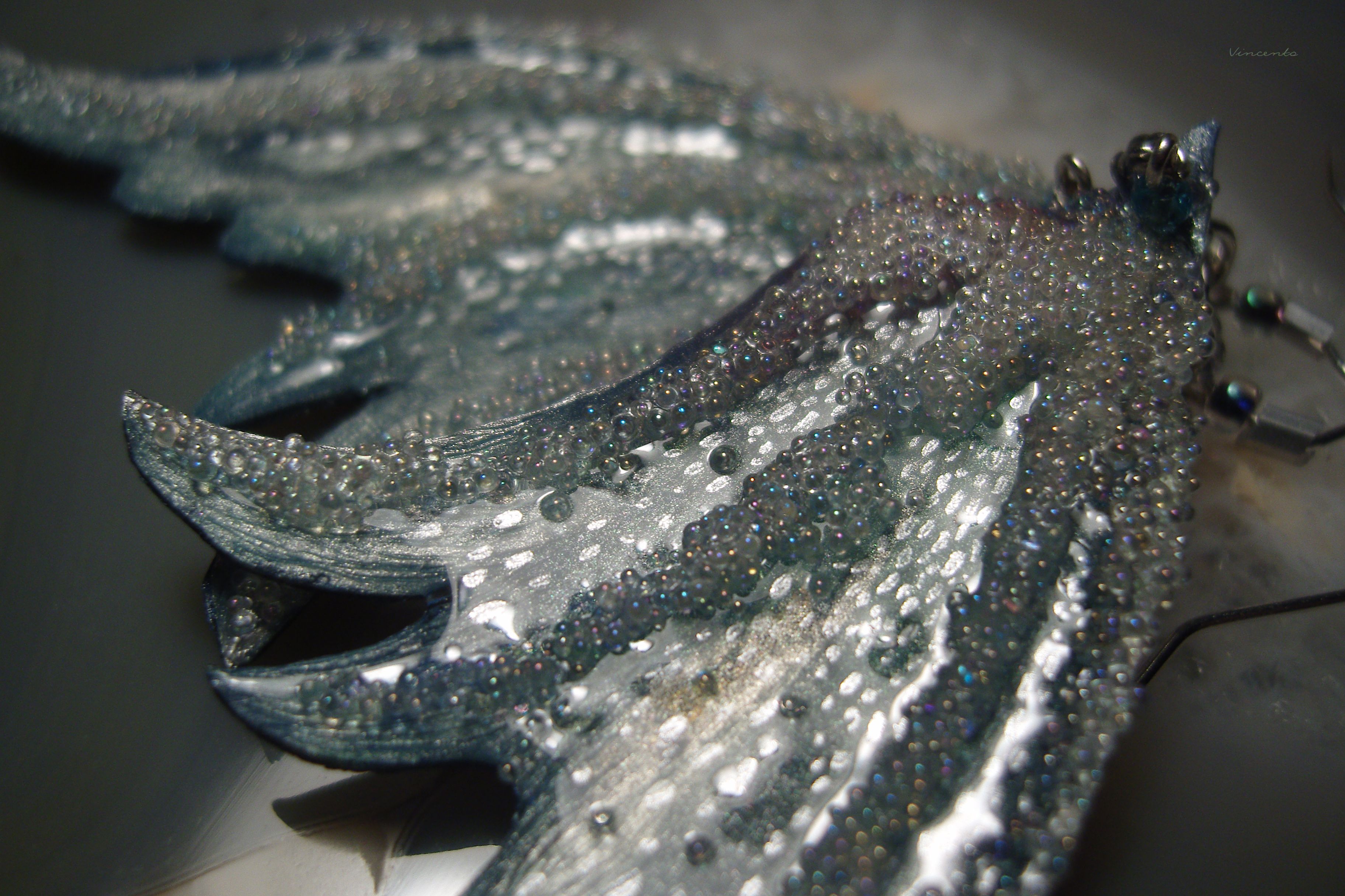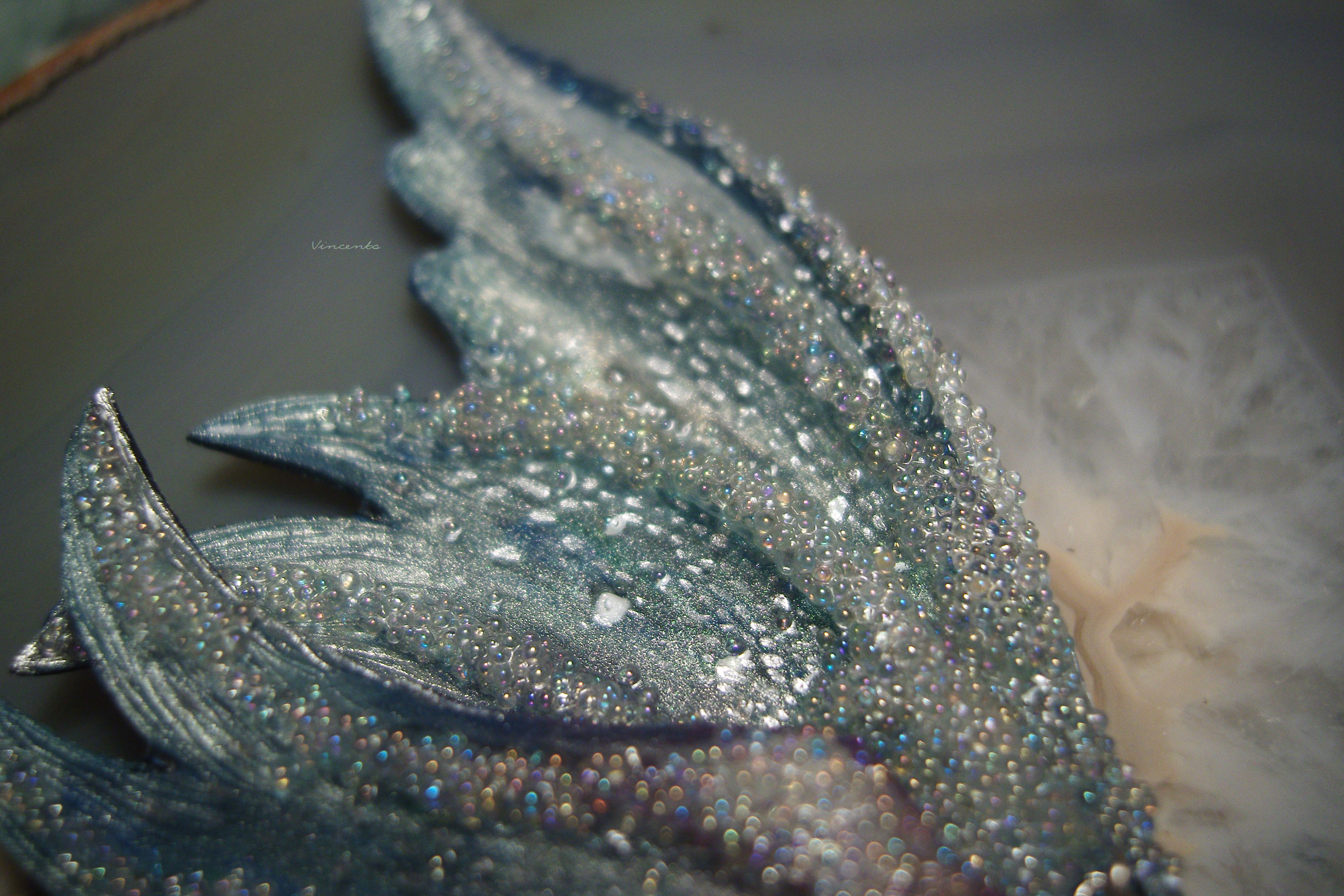 - Поверхность крыльев глянцевая и блестящая, словно подтаявший лёд, что создаёт глубину и чудесным образом оживляет украшение. А узор, сверкающий, словно только что выпавший снег, выложен мельчайшими крупинками-кристалликами, напоминающими застывшие брызги холодного моря...