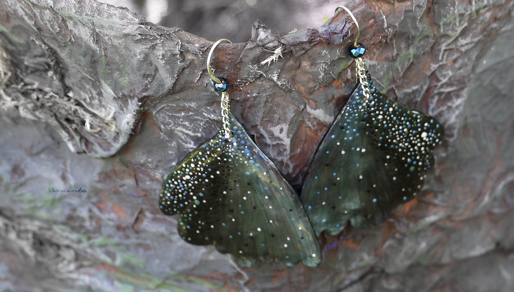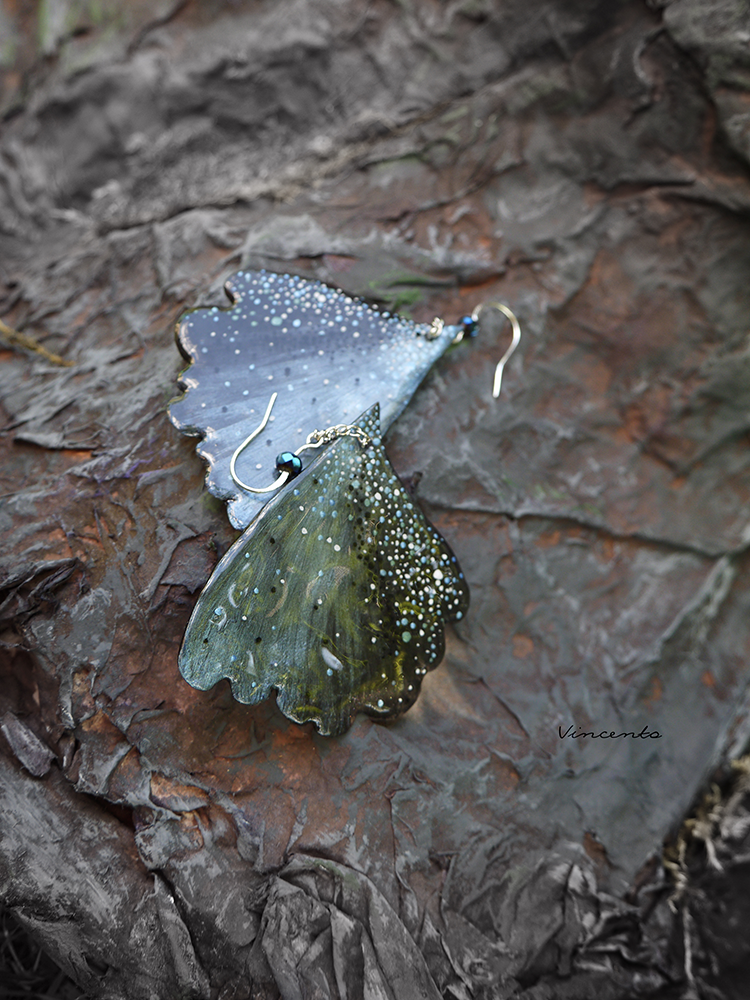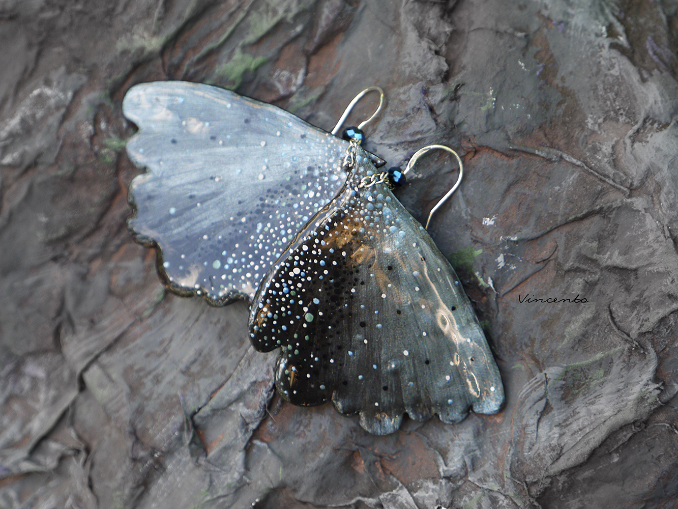 - "Крылышки Туманной Феи" - необычные крупные серьги в виде крыльев волшебного существа из Сумрачного Леса. Вы, конечно, слышали о Туманных Феях? Они обитают на берегах озёр и появляются на рассвете, когда густая пелена тумана покрывает водную гладь... А в середине лета - июле-августе - они сбрасывают свои старые крылышки, чтобы успеть обзавестись новыми к холодам. Так вот эти самые крылышки мы и нашли во время недавней прогулки по Тропе Эльфов!
