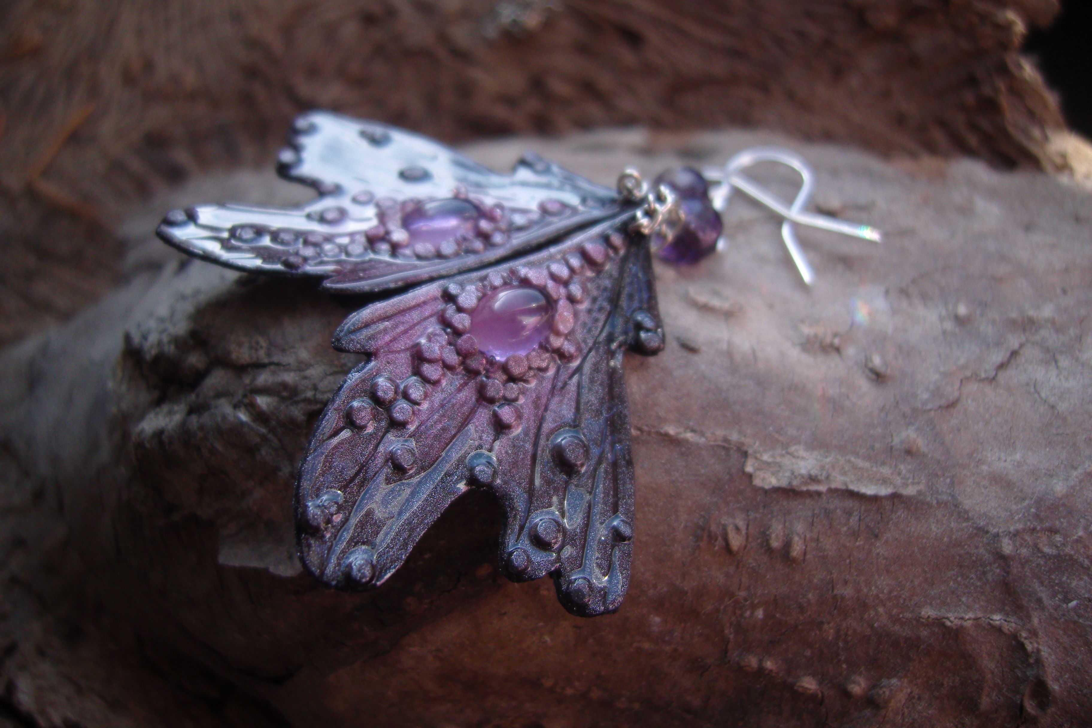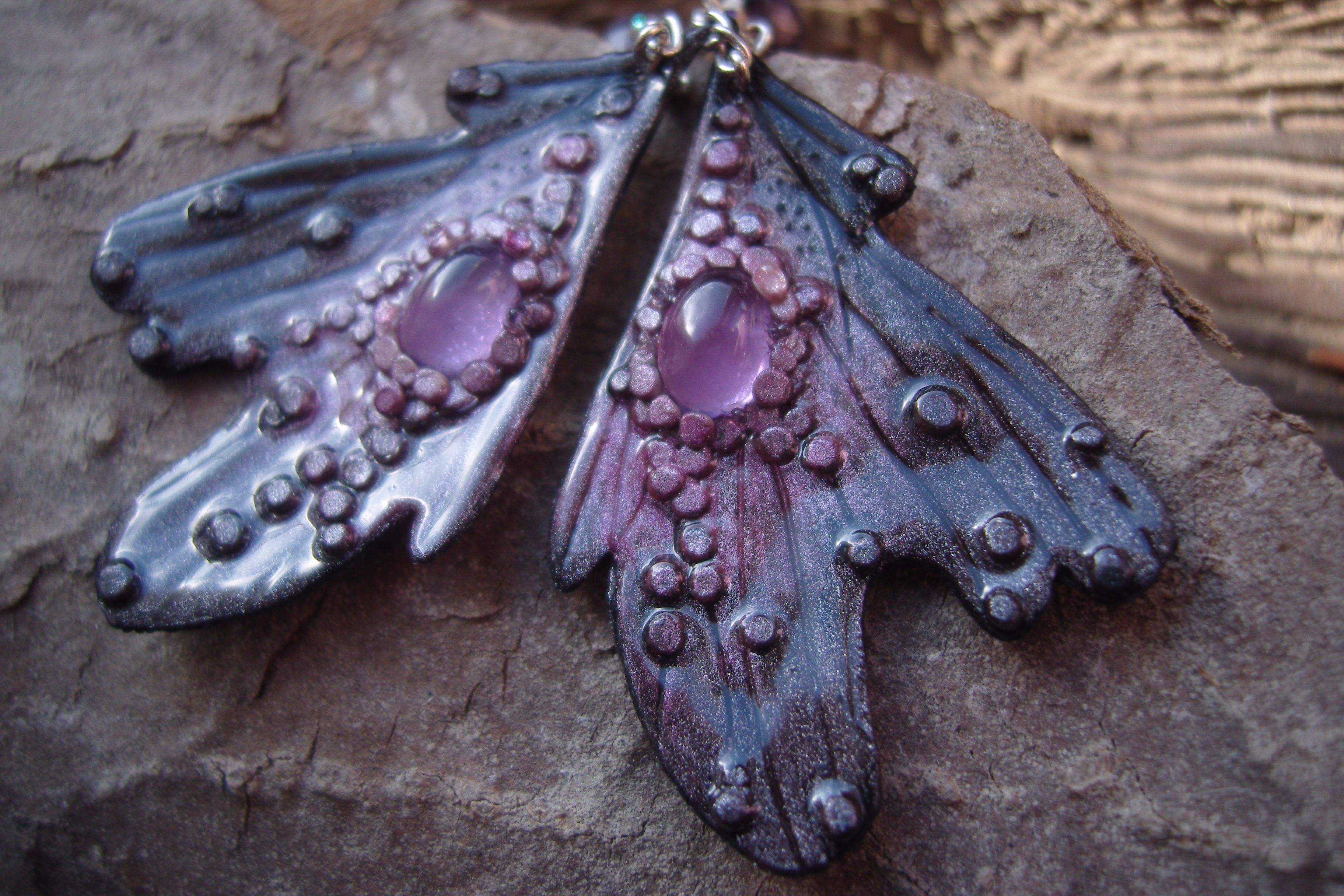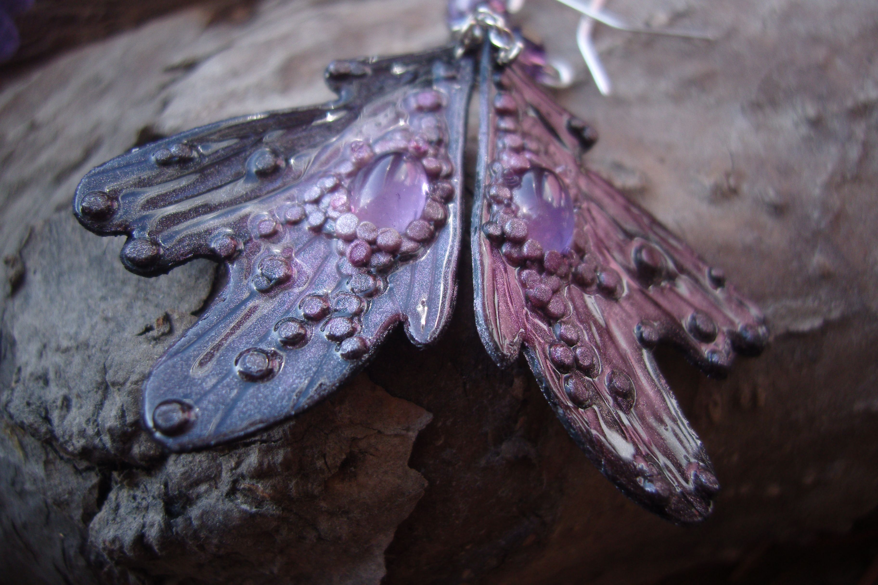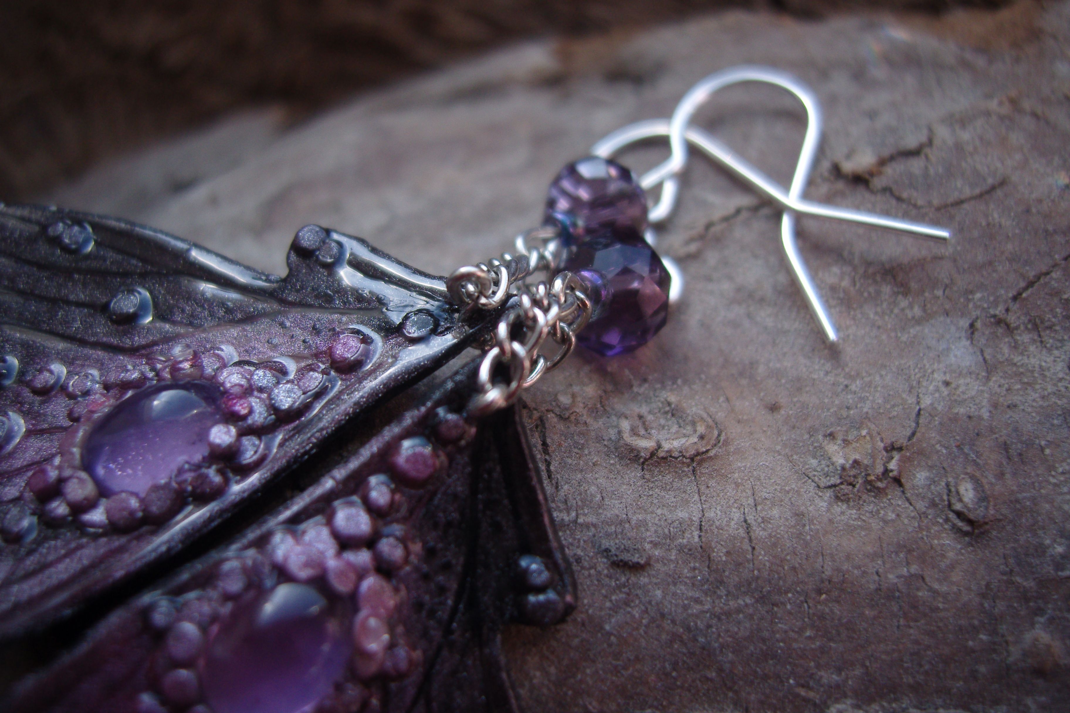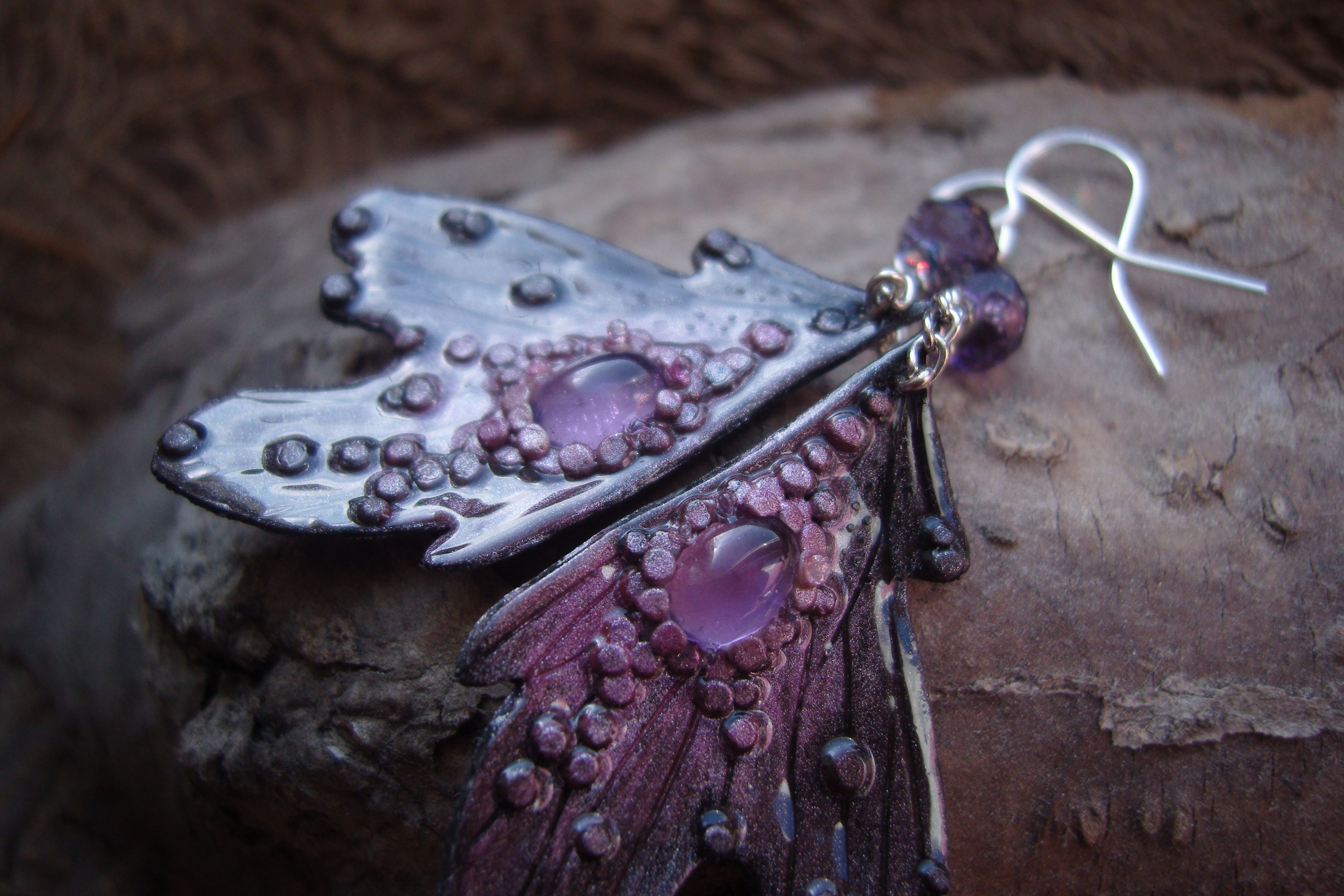 - Изысканные и совершенно волшебные серьги в виде крылышек настоящей Причудливой феи, украшенные камешками натуральных аметистов.