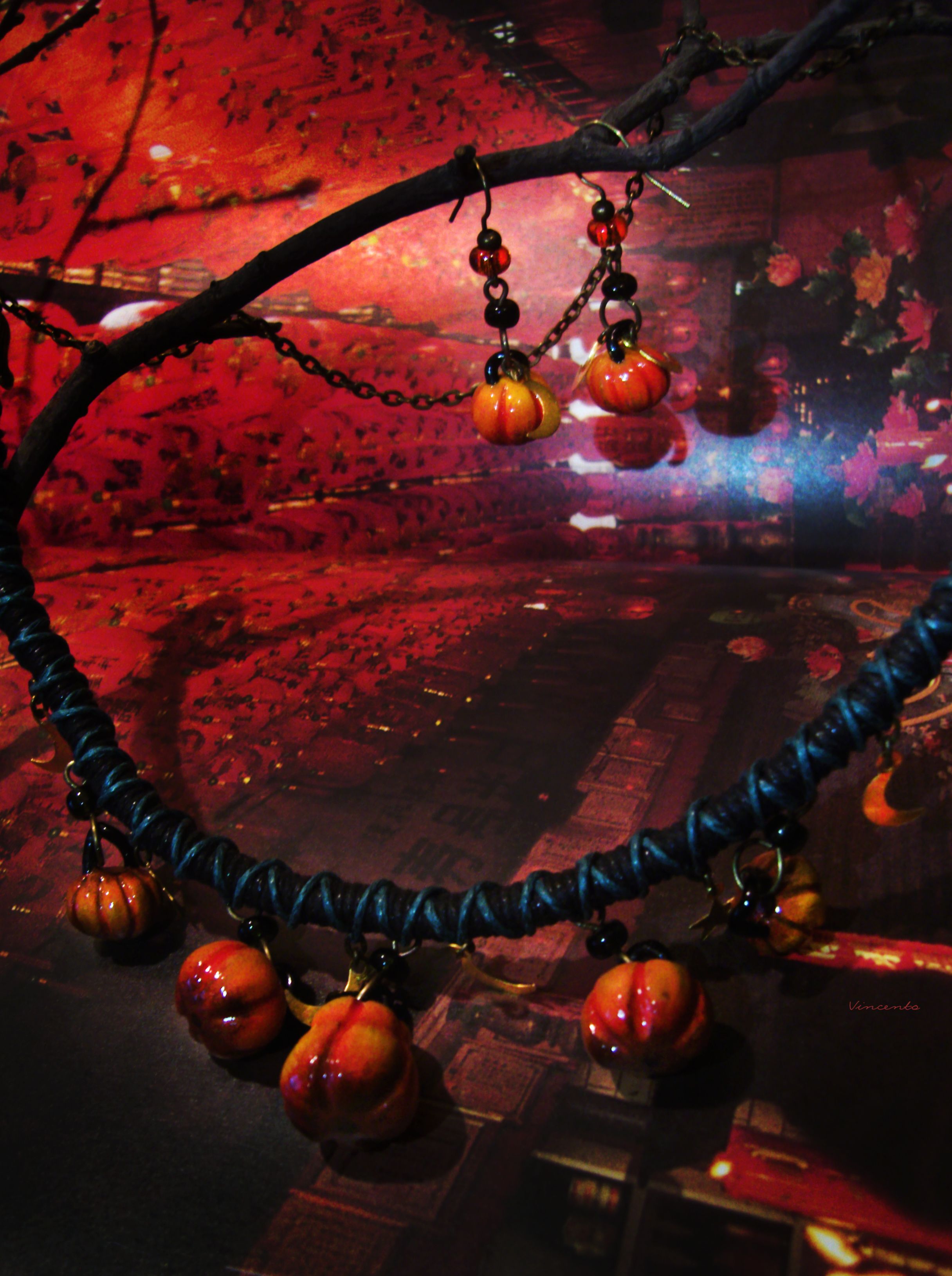 "Время Самайна", комплект украшений (серьги и колье) с тыквами к Хэллоуину