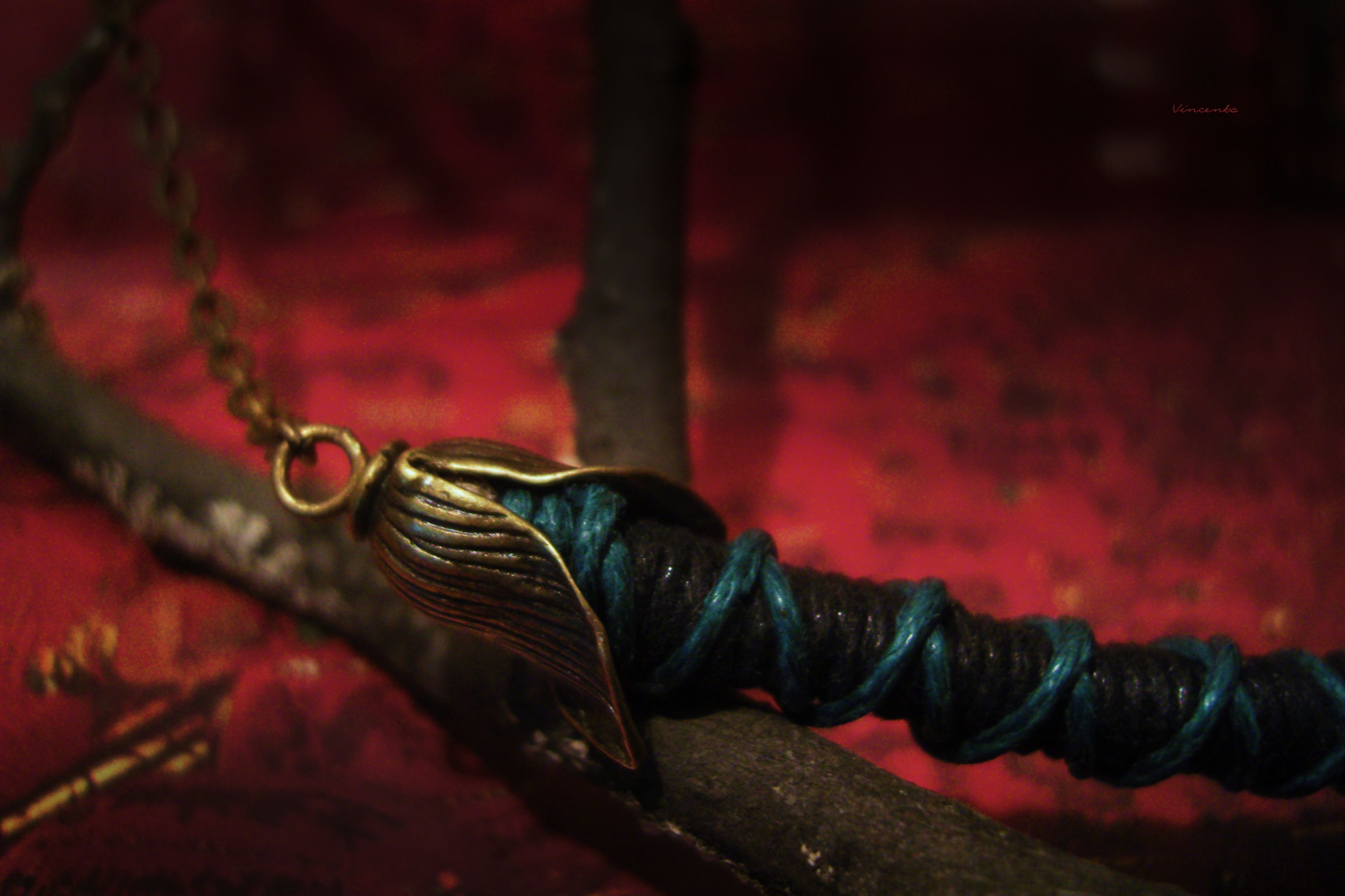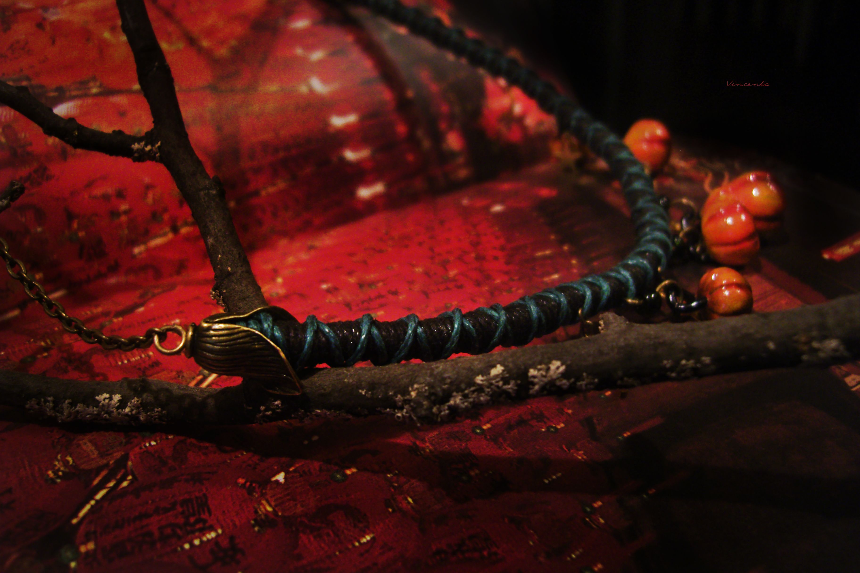 - Плотный жгут колье сплетён вручную нашими мастерами на основе вощёных шнуров чёрного и пепельно-изумрудного оттенков, дополнен бронзовой цепочкой и шапочками-листьями, а также стеклянными бусинами ручной отливки тёмно-зелёного, почти чёрного цвета.