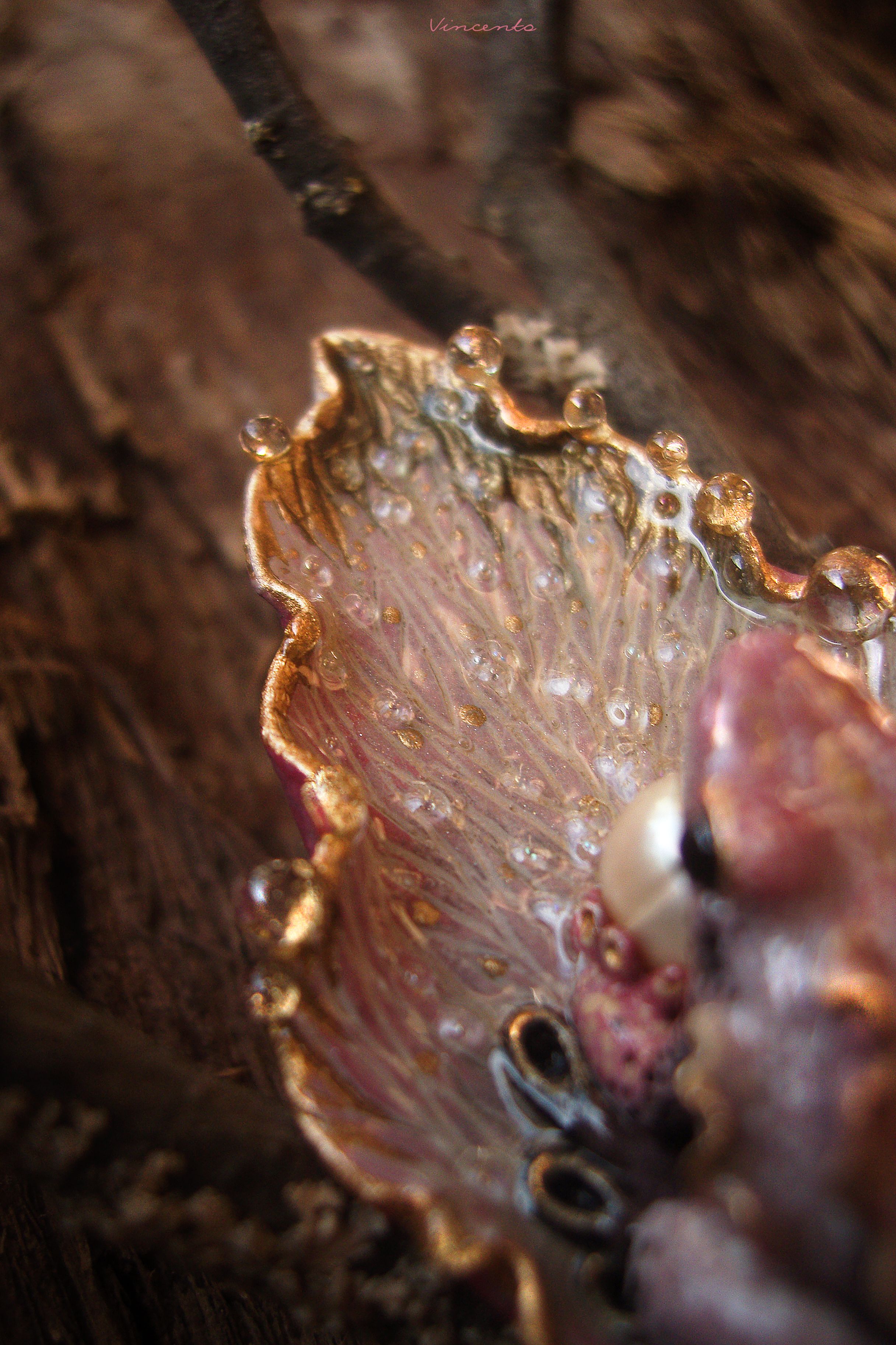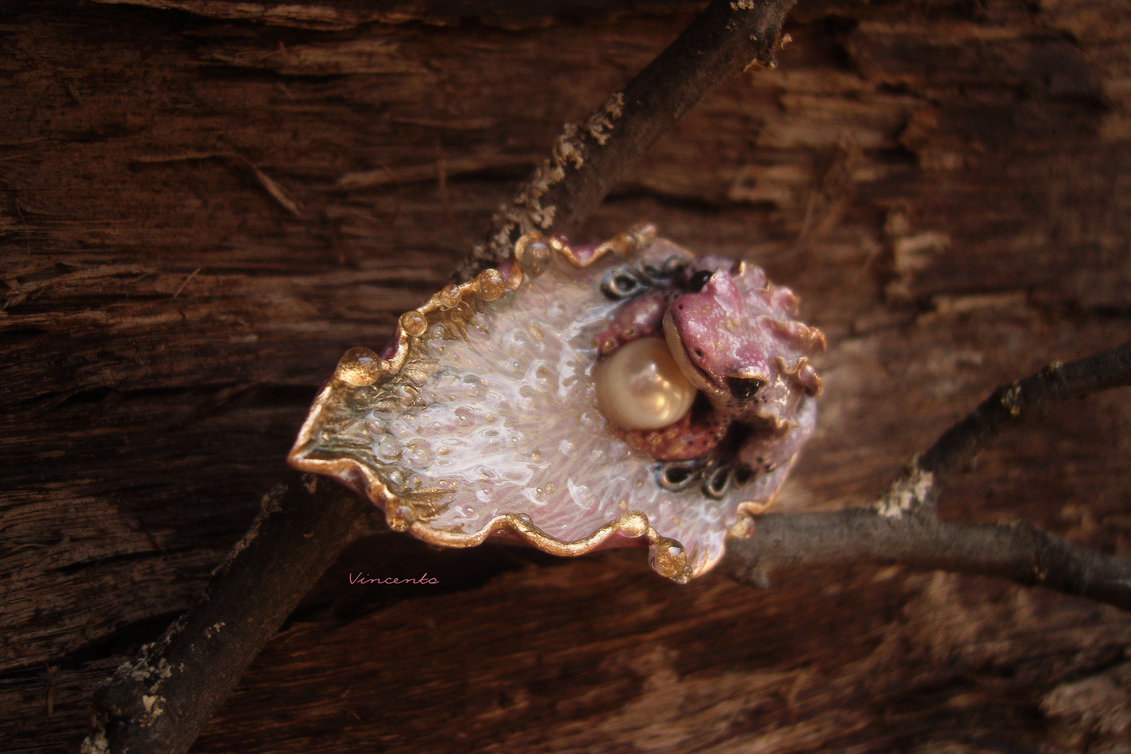 - Утончённое украшение с жемчужиной и миниатюрной лягушечкой на изящном лепестке волшебного цветка — фэнтезийная брошь на стыке стилей шебби и модерн.